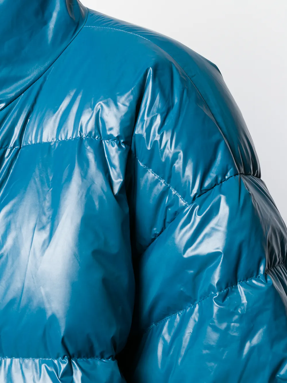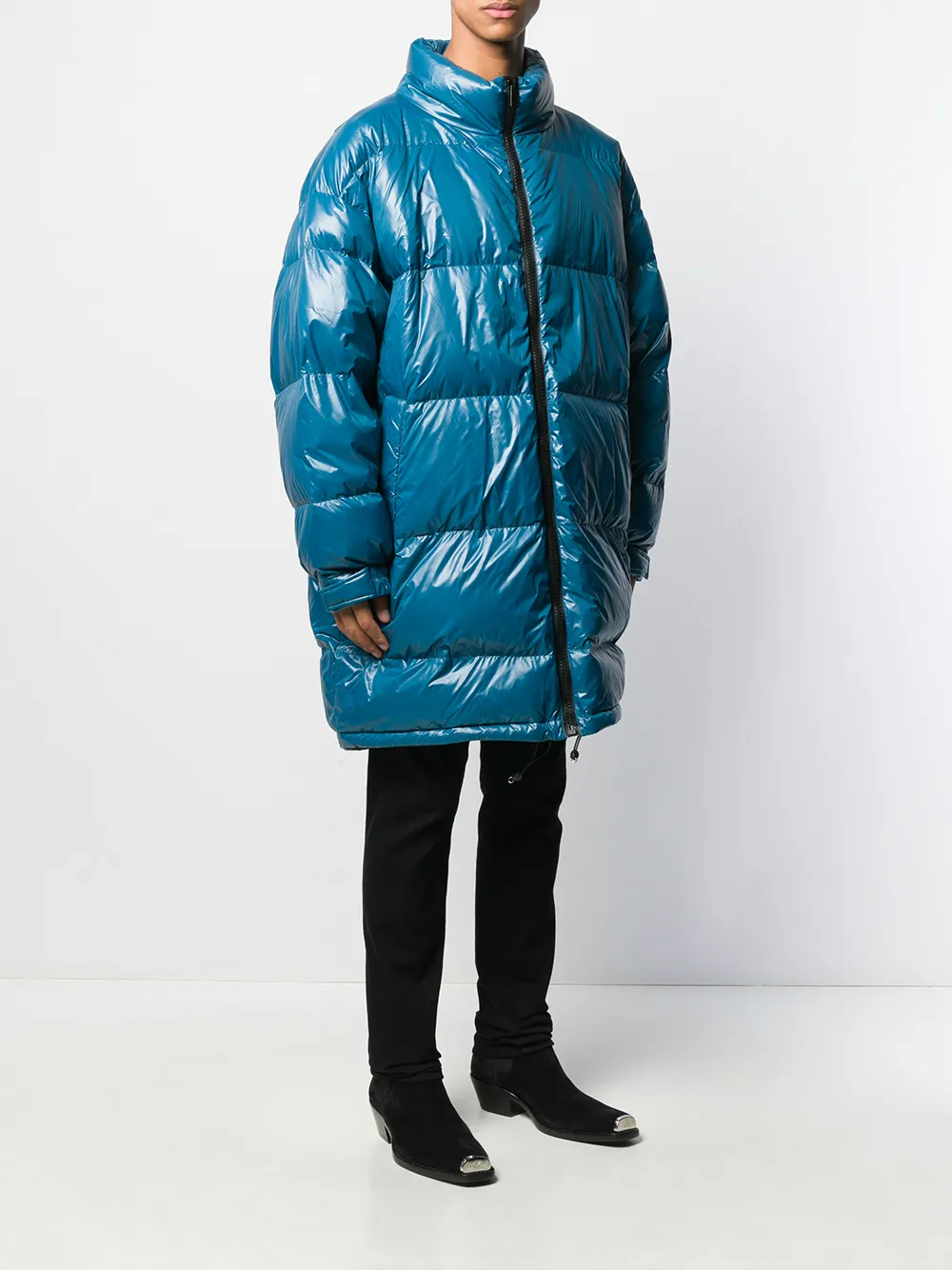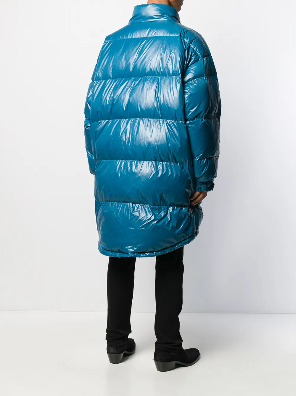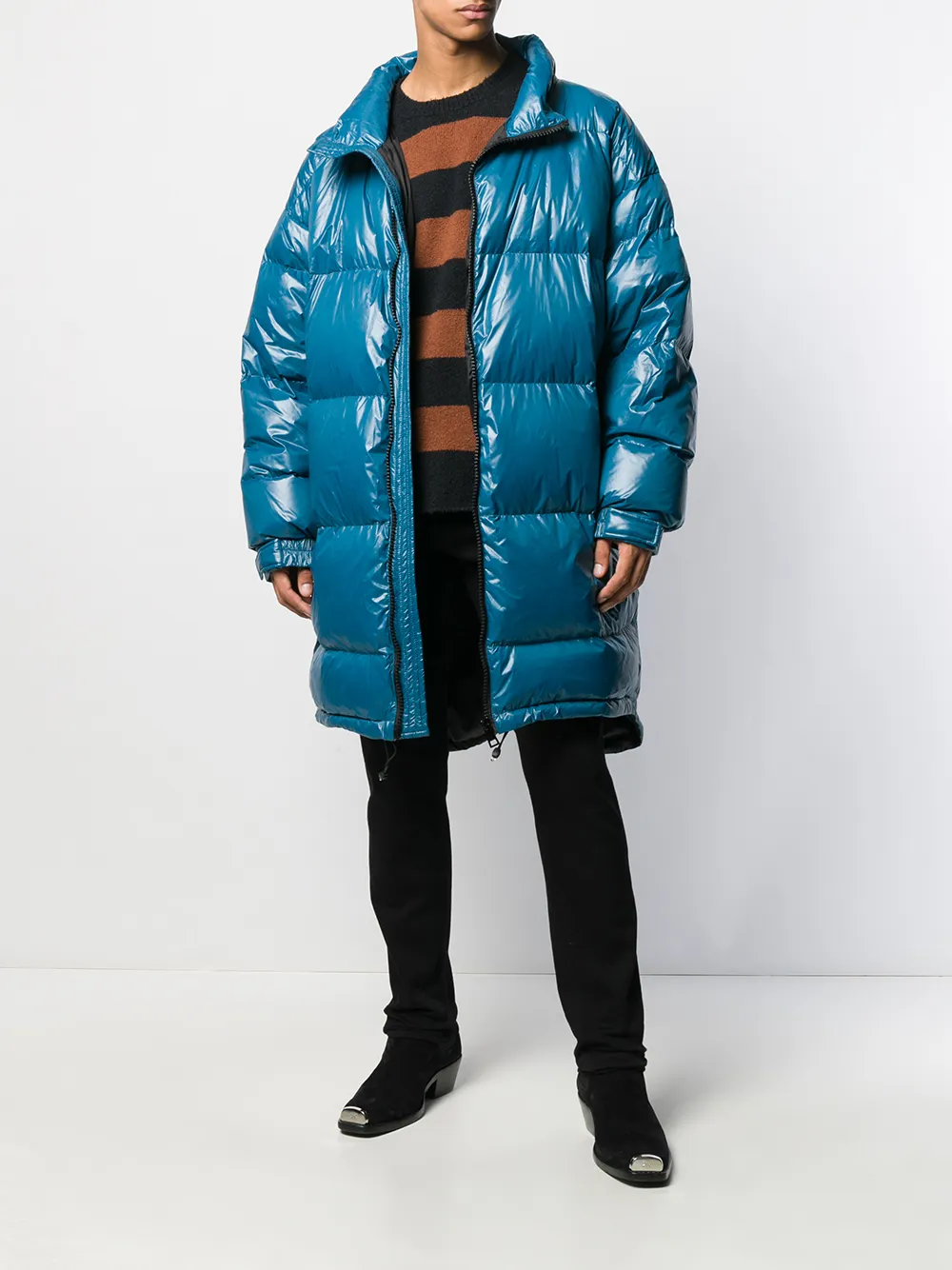 Стеганое пальто-пуховик оверсайз от Paura. Воротник с высокой стойкой, застежка на молнии спереди, длинные рукава, эластичные манжеты, прорезные карманы по бокам, подол на шнурке и средней длины. Цвет: синий.