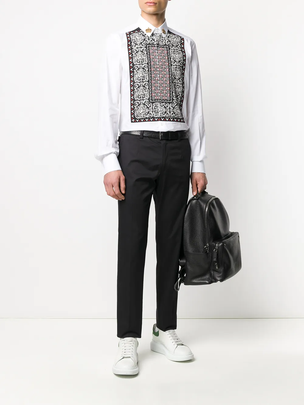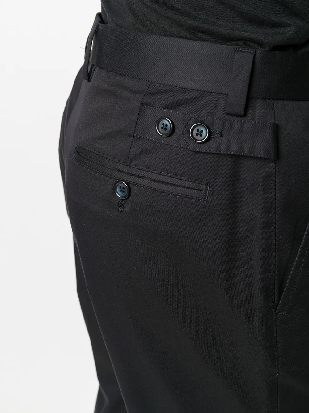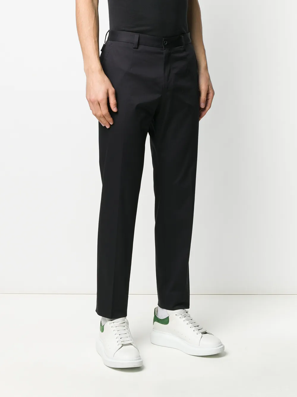 В поисках элегантного образа в рамках smart casual? Советуем сделать ставку на Dolce & Gabbana (Дольче энд Габбана). В коллекцию итальянского бренда вошли темно-синие брюки строгого кроя из эластичного хлопка. Модель имеет ширинку на молнии с пуговицей, петли для ремня, боковые карманы, два задних прорезных кармана на пуговицах и укороченную длину.