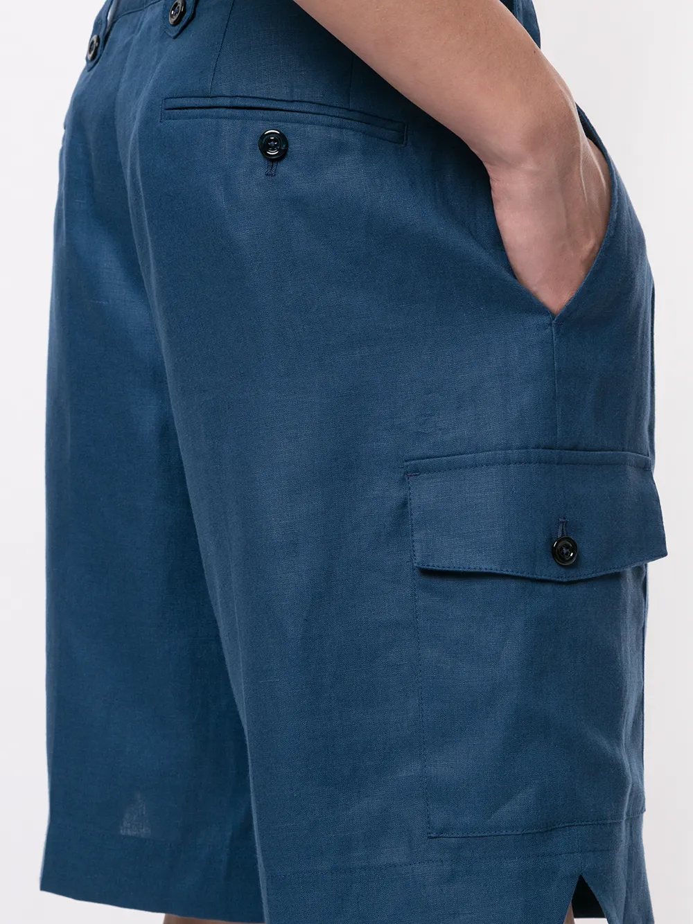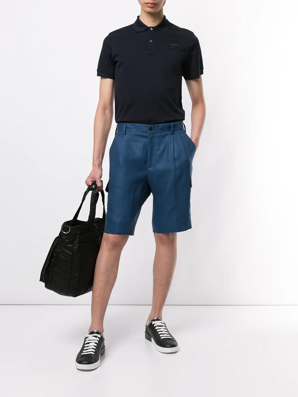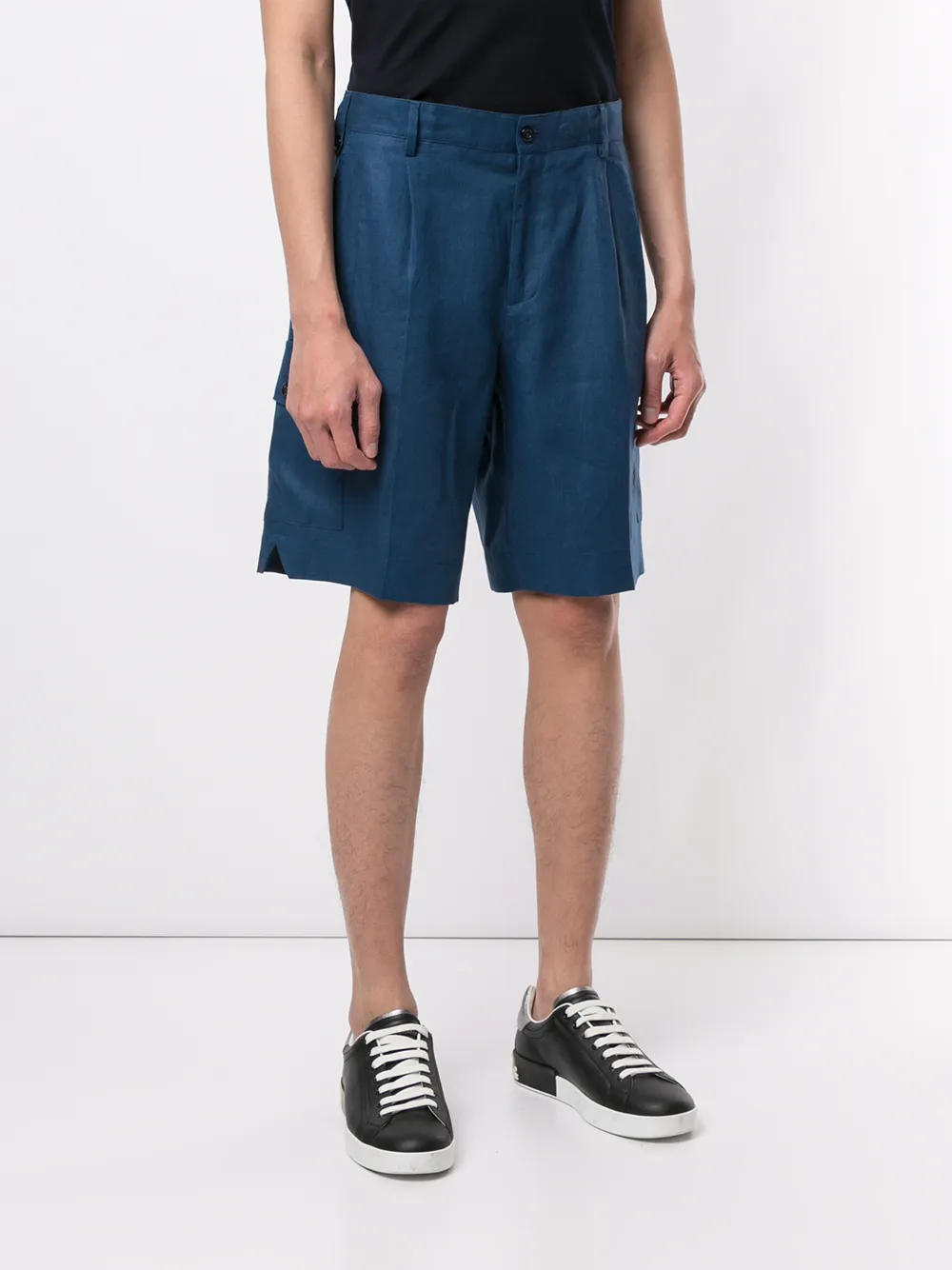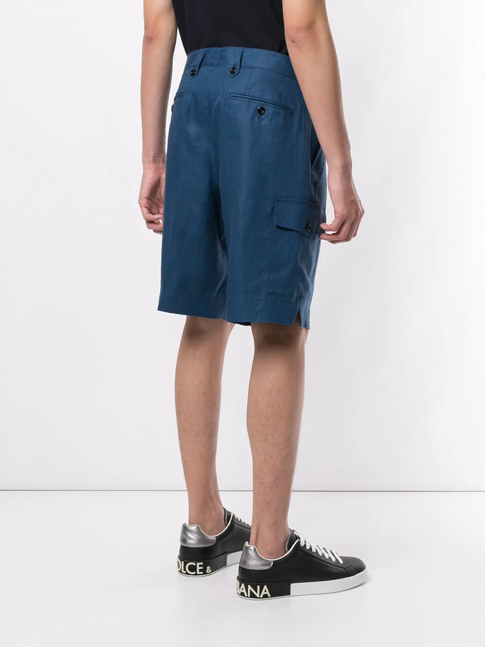 Весна идет, весне дорогу! В коллекцию Dolce & Gabbana (Дольче энд Габбана) весна-лето 2020 вошли синие льняные шорты-бермуды. Идеальный вариант для теплой погоды. Модель имеет петли для ремня, ширинку на пуговице, боковые карманы, два задних прорезных кармана на пуговицах, складки и карманы по бокам. POSITIVELY CONSCIOUS: Как минимум 50% основного материала, из которого сделан этот товар, отвечает нашим критериям экологичности. В состав входят органические или переработанные материалы и ткани, которые признаны более экологичными (лен, рами, тенсел и т.д.)
