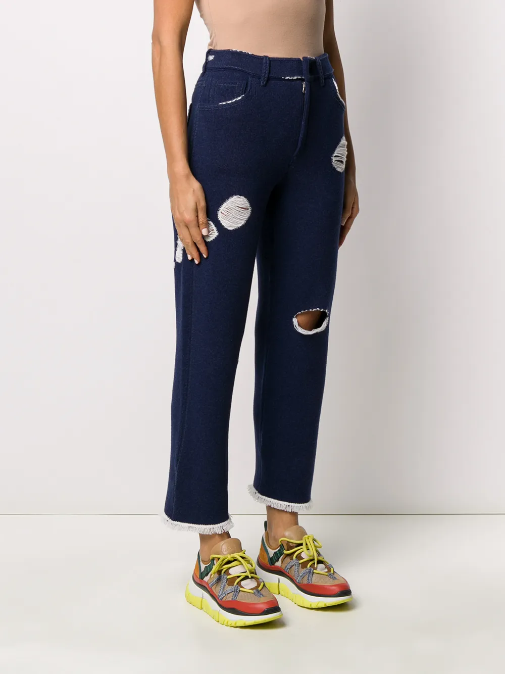 Брюки бойфренда из денима от Barrie. Завышенная талия, ширинка на молнии с пуговицей, эффект потертости, классическая пятикарманная модель и подол с бахромой. Цвет: синий.