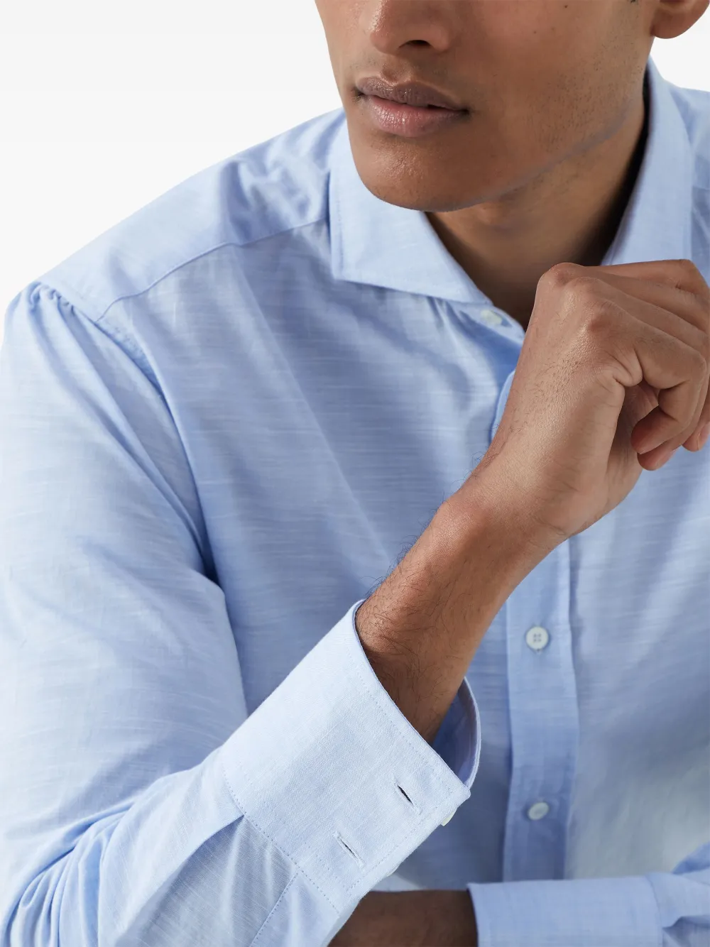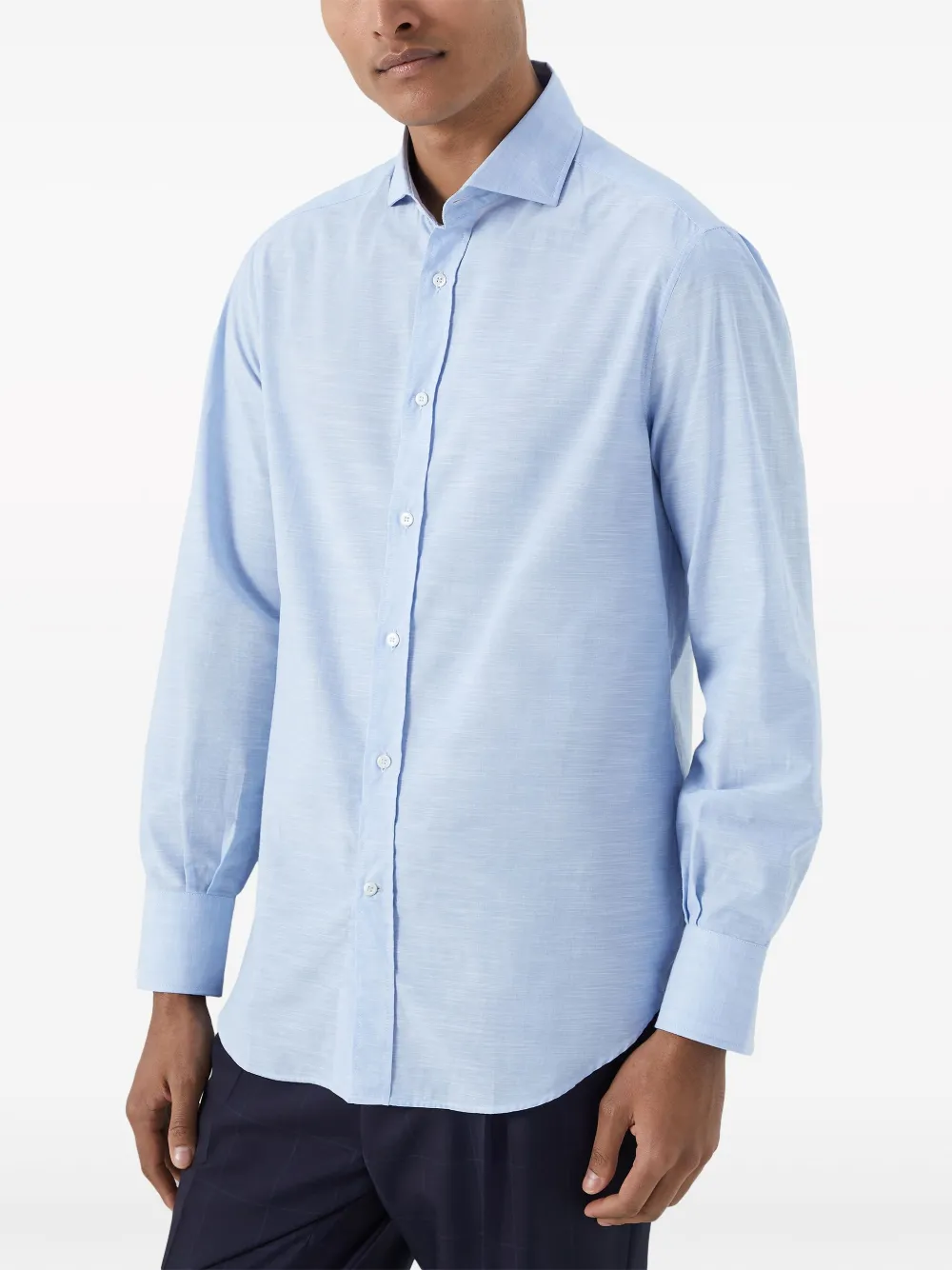 Рубашка с длинными рукавами от Brunello Cucinelli (Брунелло Кучинелли). Косой воротник, застежка на пуговицах спереди, длинные рукава, узкие манжеты и закругленный подол.