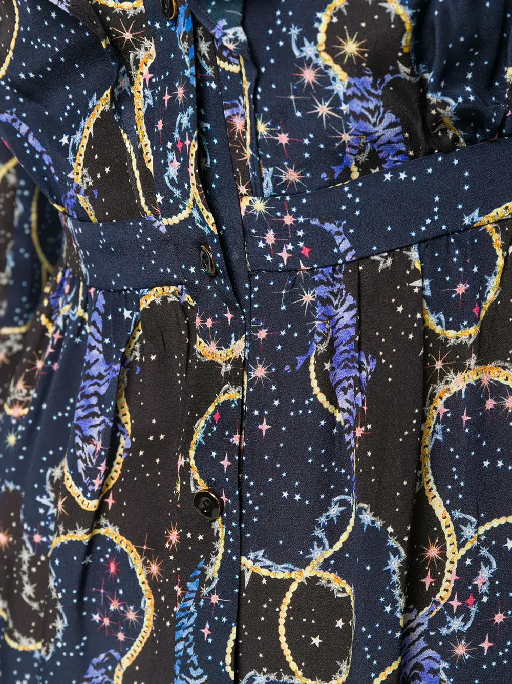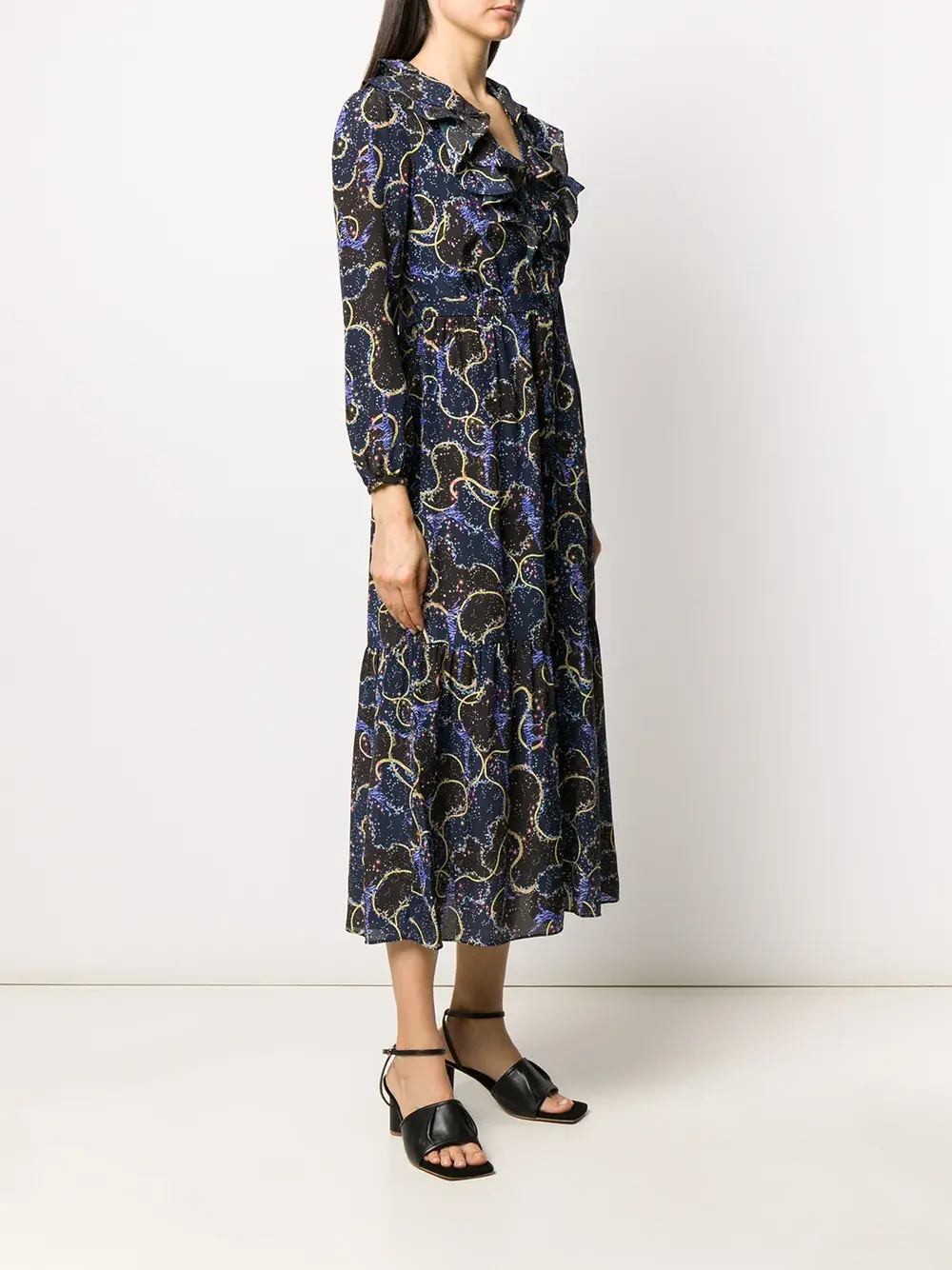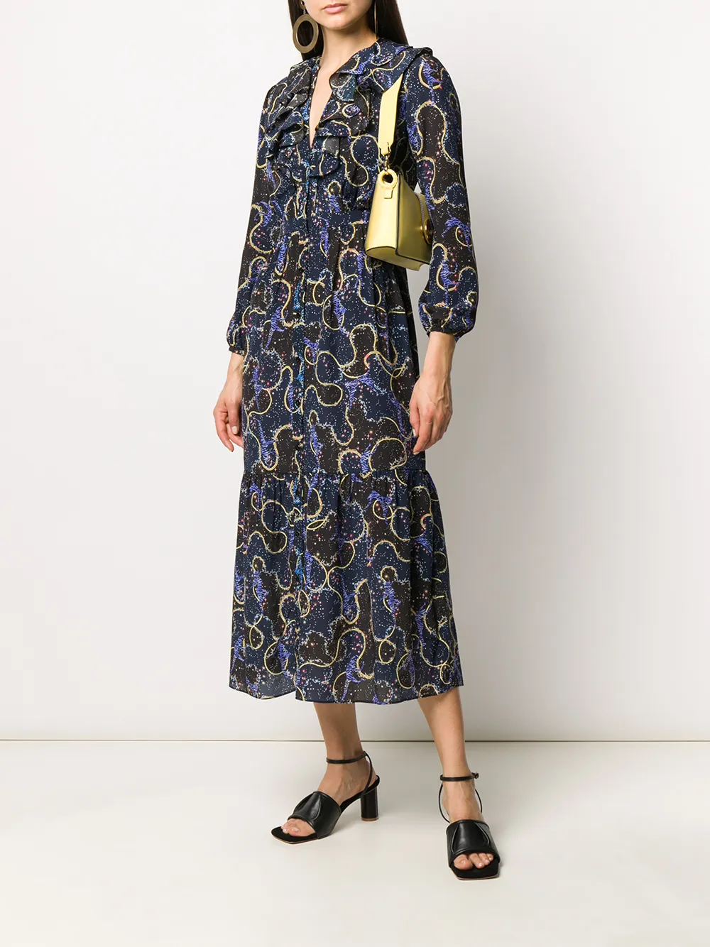 Расклешенное платье с принтом от Saloni. Воротник с рюшами, застежка на пуговицах спереди, длинные рукава, эластичные манжеты и средней длины. Цвет: синий.