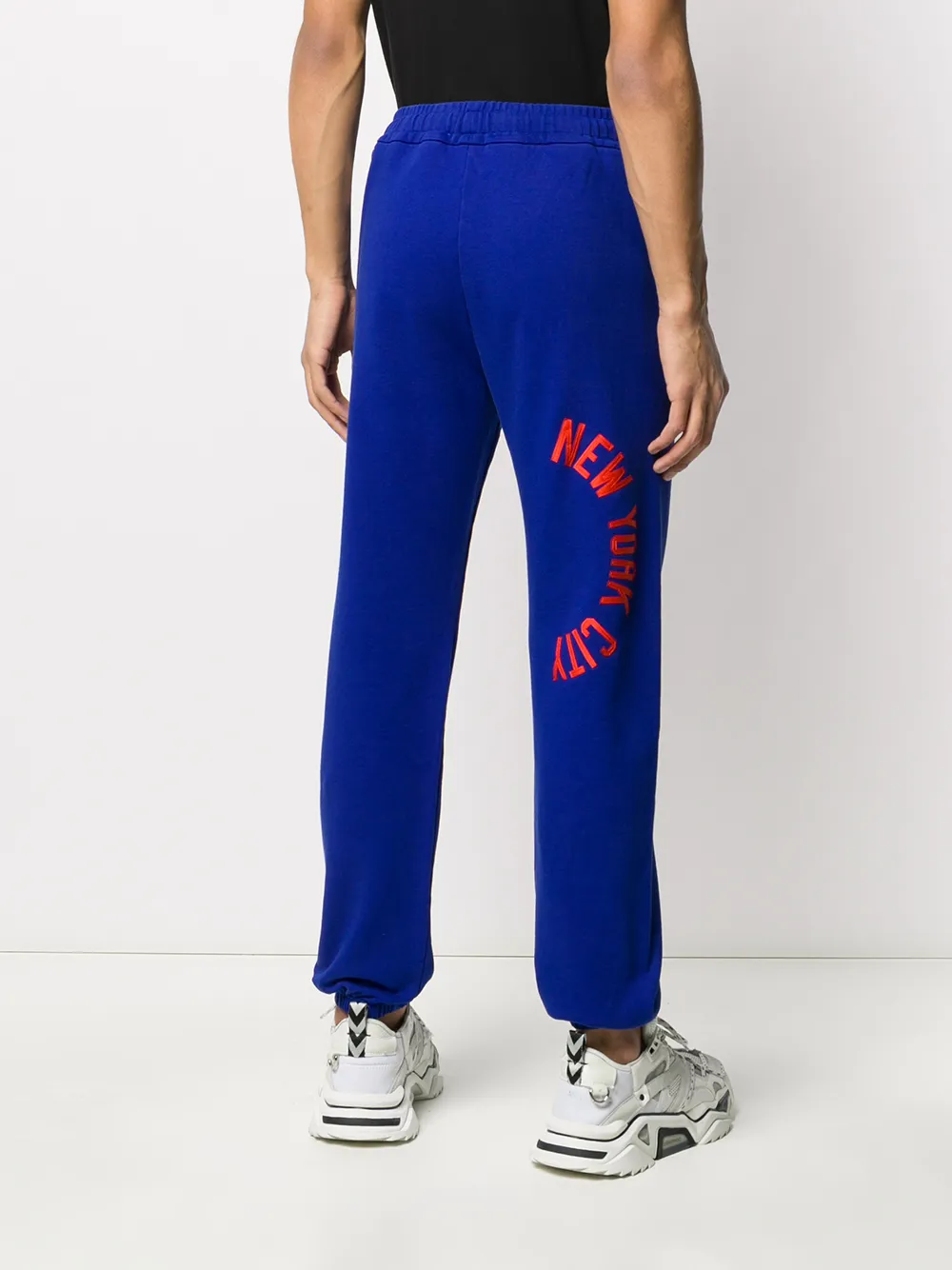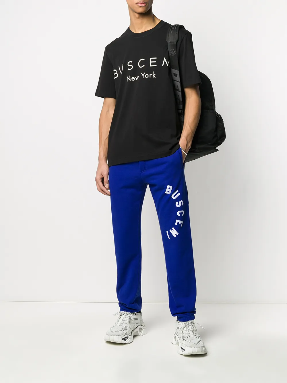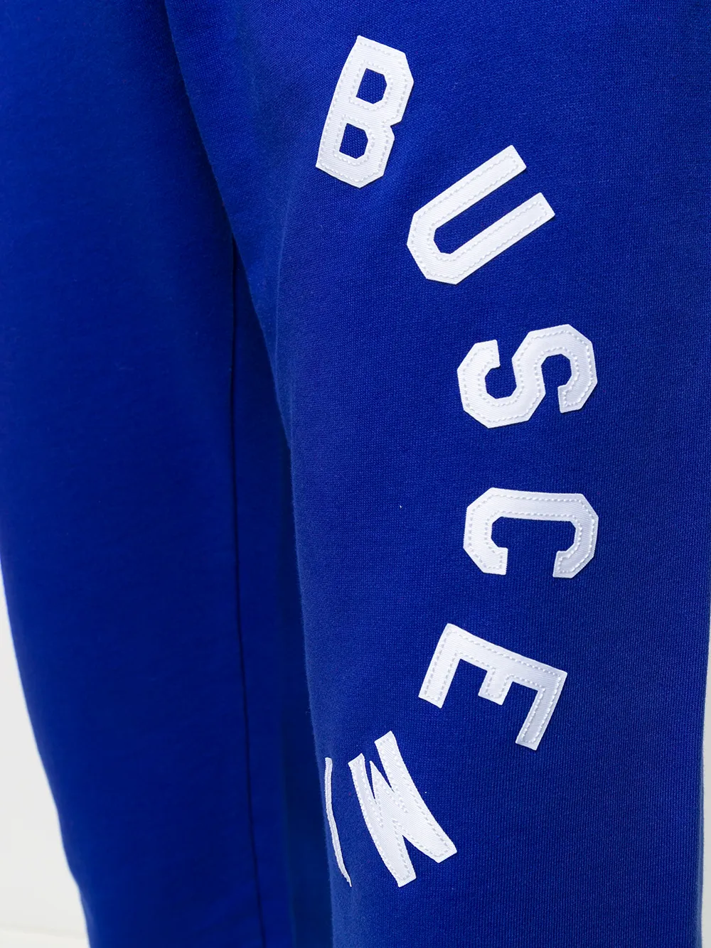 Спортивные брюки из джерси от Buscemi. Эластичный пояс, передние карманы, принт с логотипом, узкий крой, эластичные манжеты и модель без застежки.