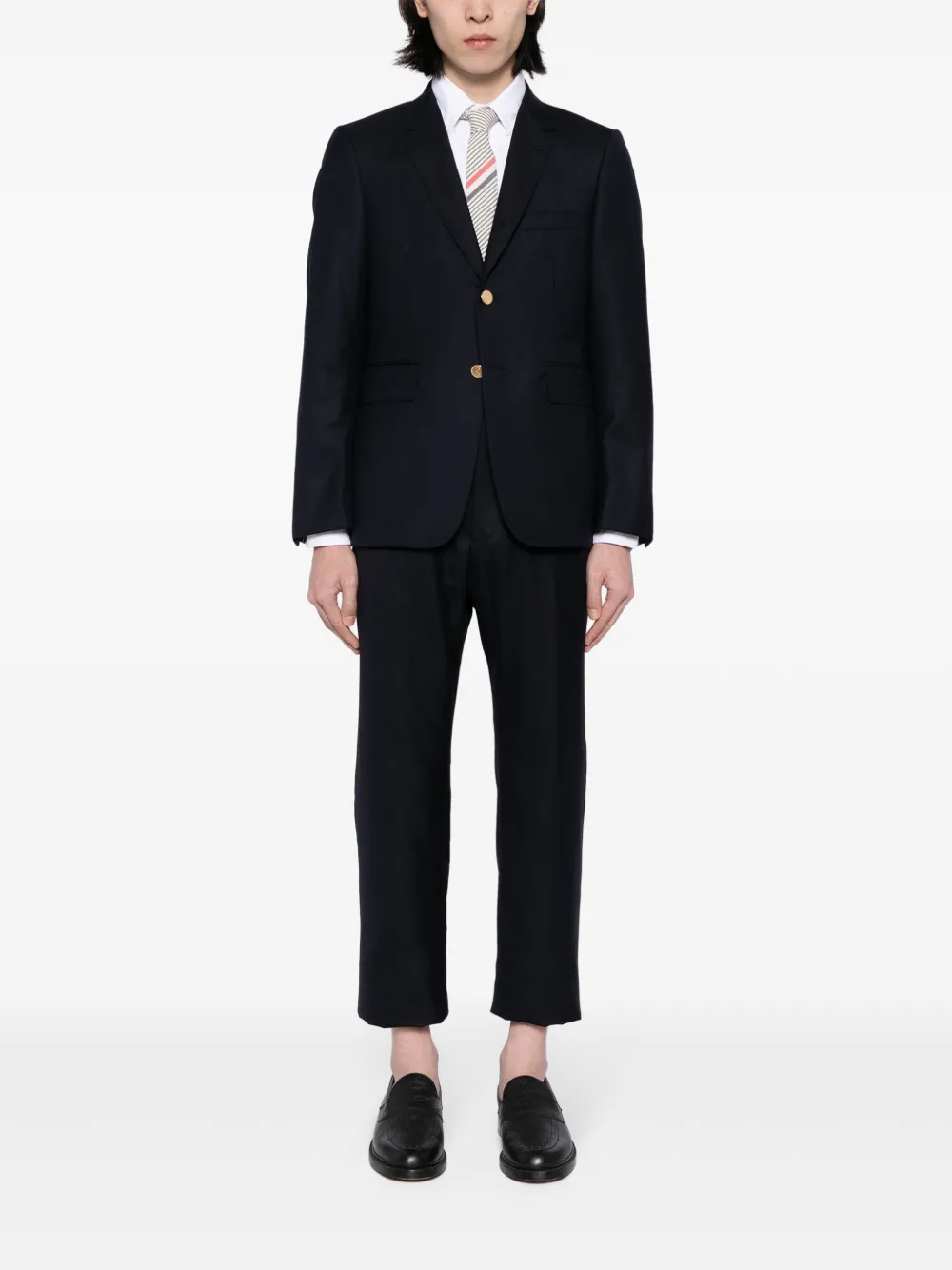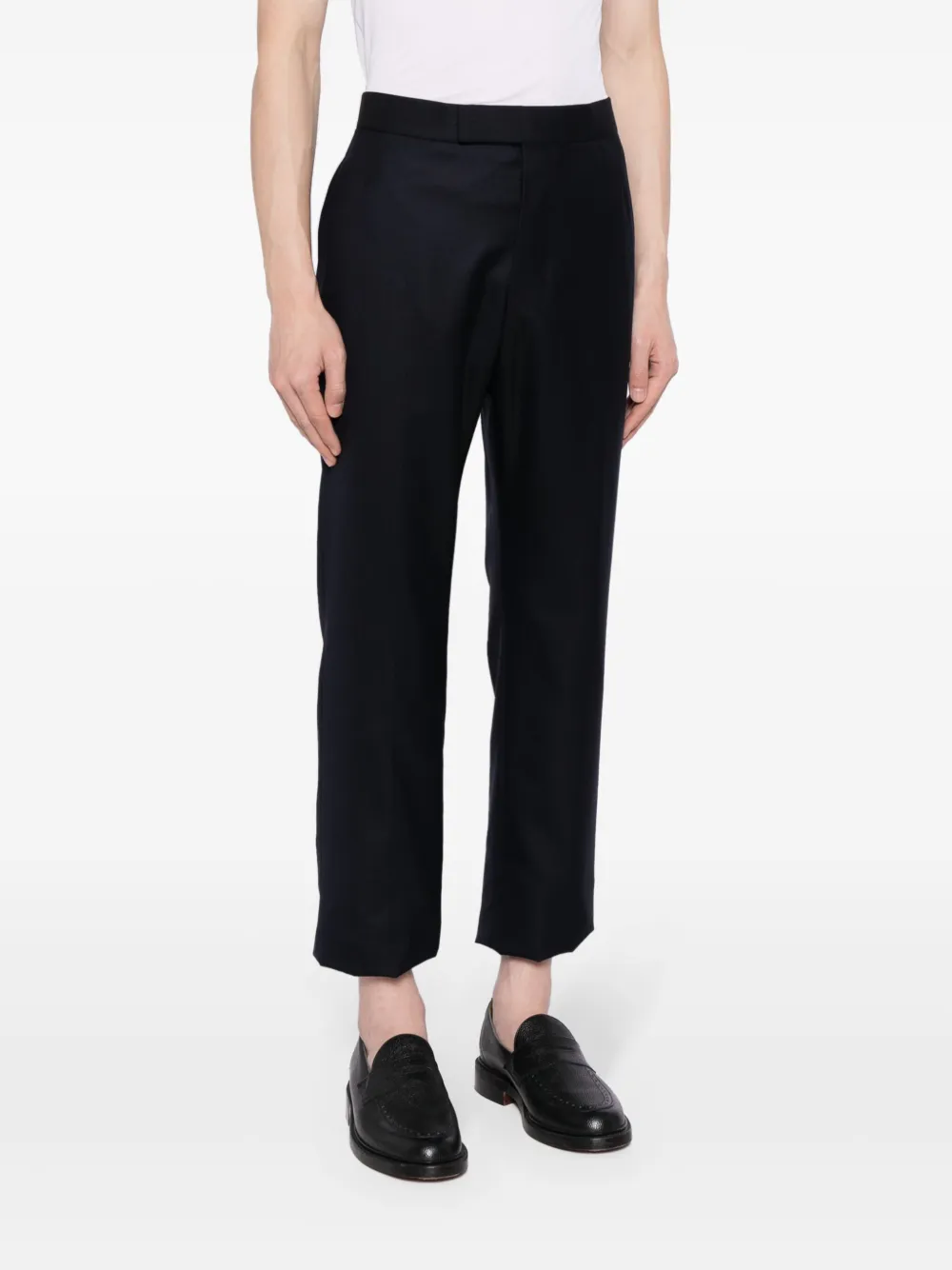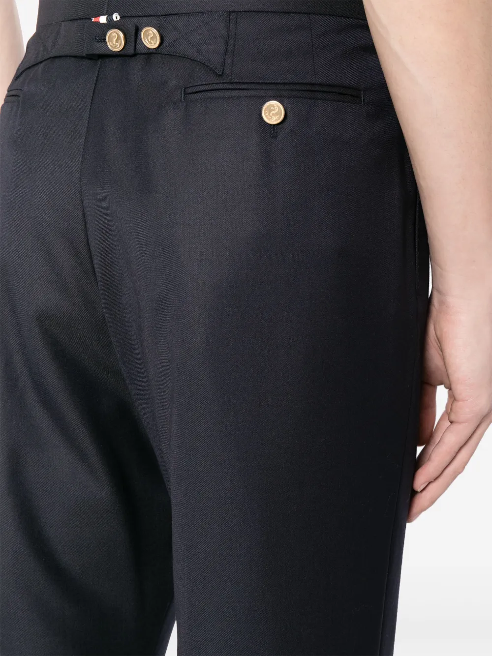 Твиловые брюки от Thom Browne. Прямые брючины, завышенная посадка, потайная застежка спереди, ремешок сзади, два задних прорезных кармана на пуговицах, подвернутый подол и обрезанная длина.