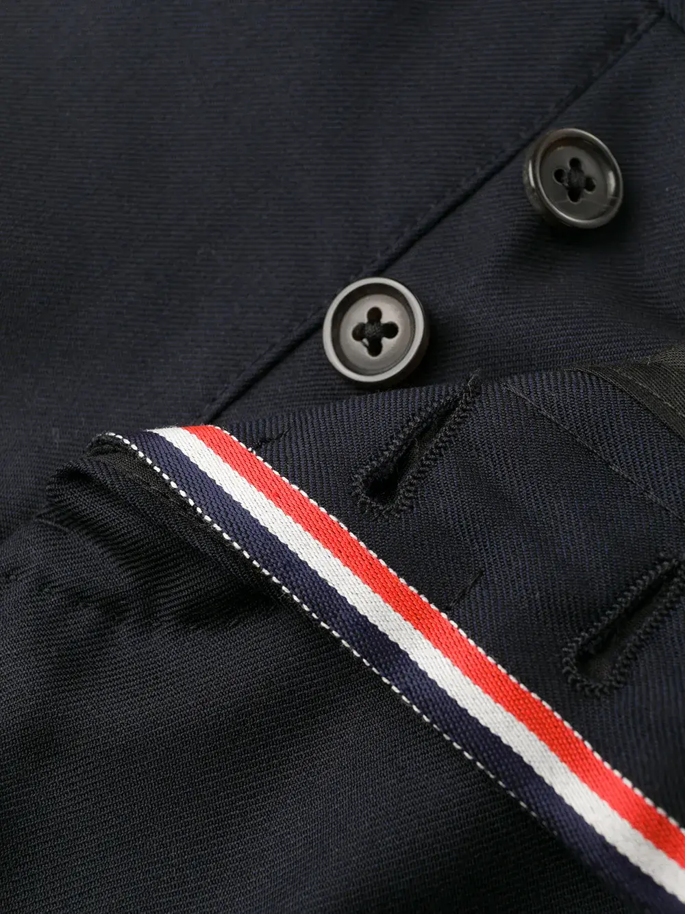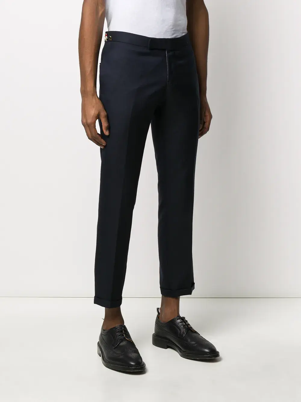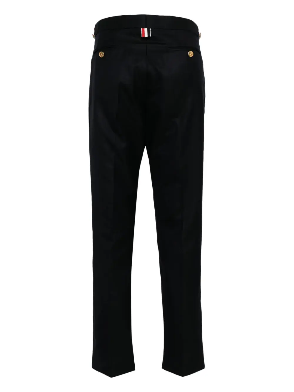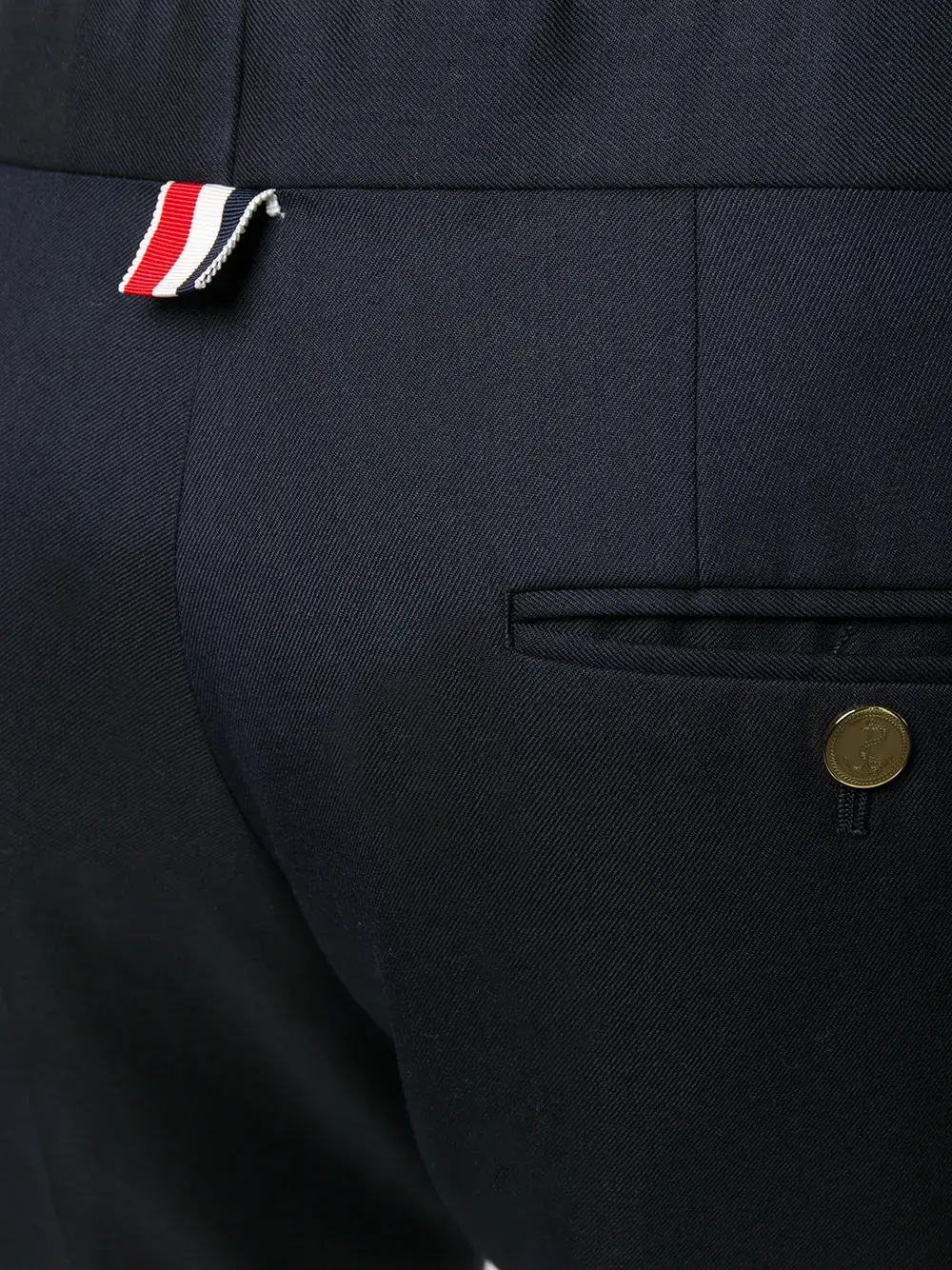 Твиловые брюки от Thom Browne. Узкий крой, средняя посадка, потайная застежка спереди, прорезные карманы по бокам, два задних прорезных кармана на пуговицах, подвернутый подол и укороченная длина.