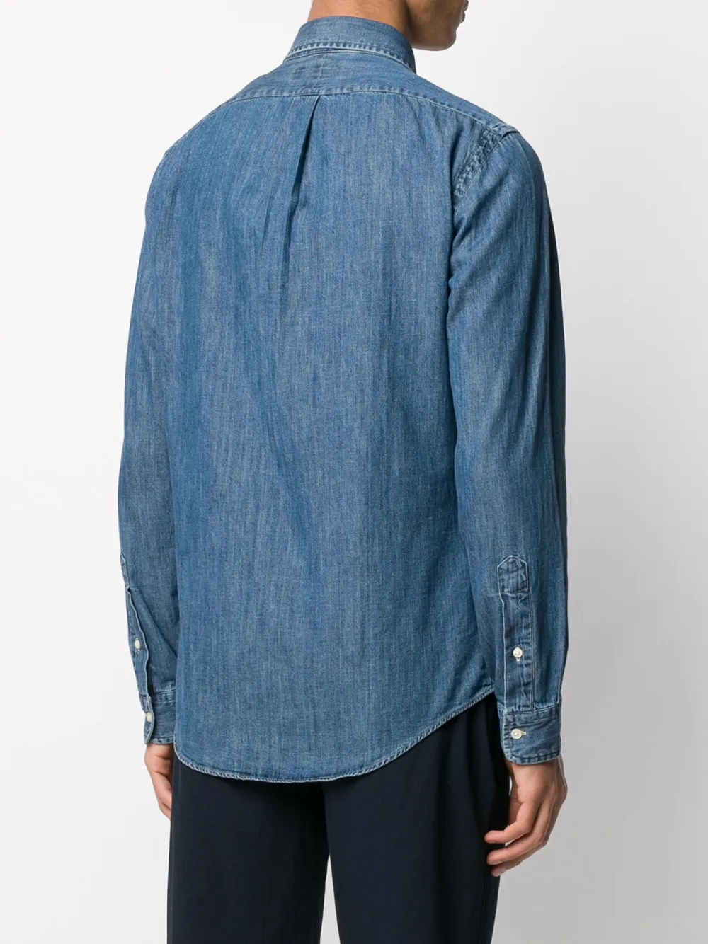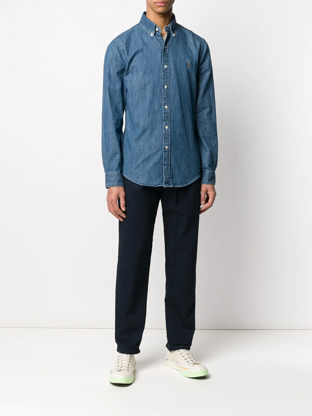 Джинсовая рубашка с логотипом от Polo Ralph Lauren (Поло Ральф Лорен). Контрастный вышитый логотип на груди, классический воротник на пуговицах, застежка на пуговицах спереди, длинные рукава, манжеты на пуговицах и закругленный подол.