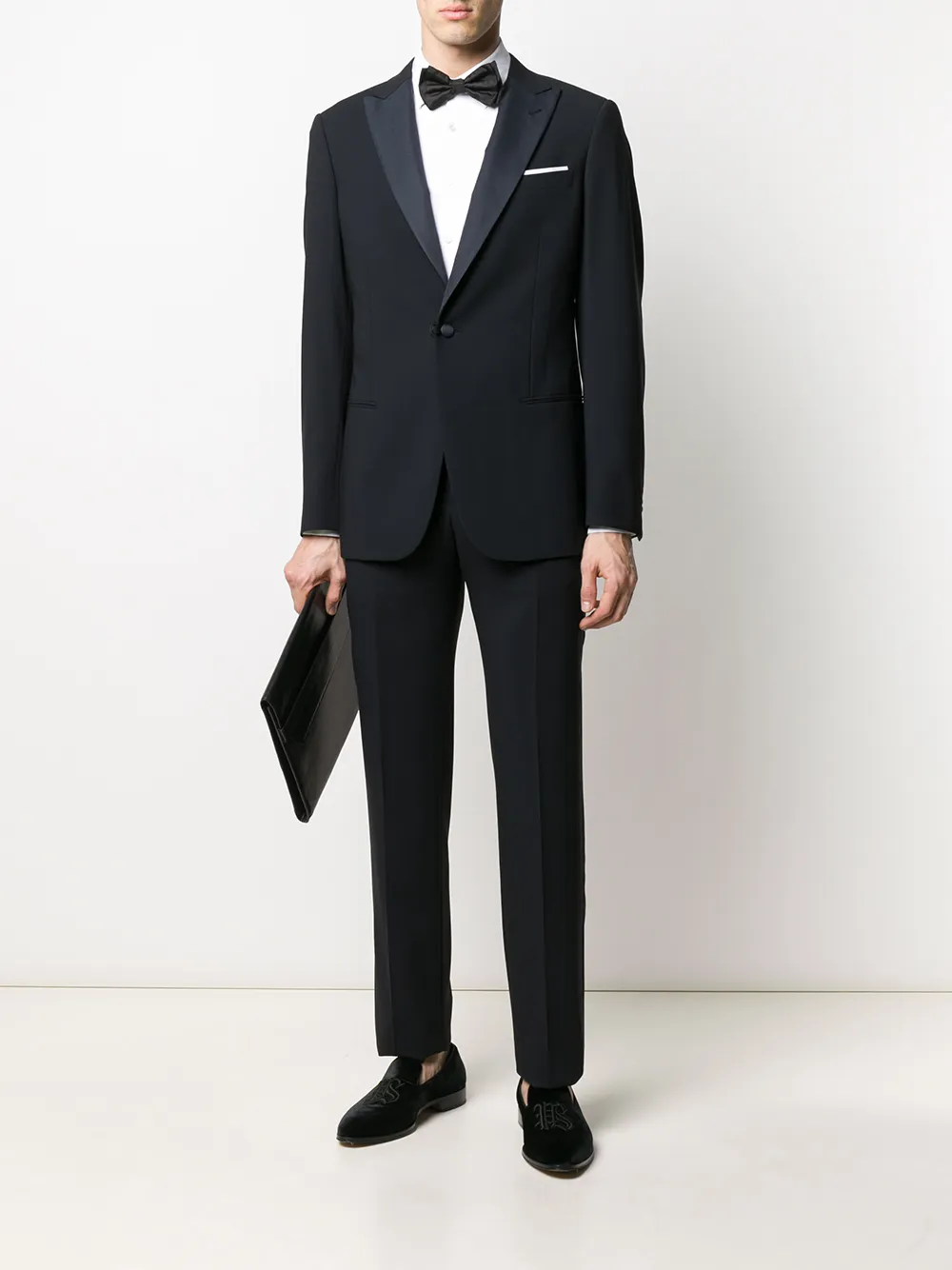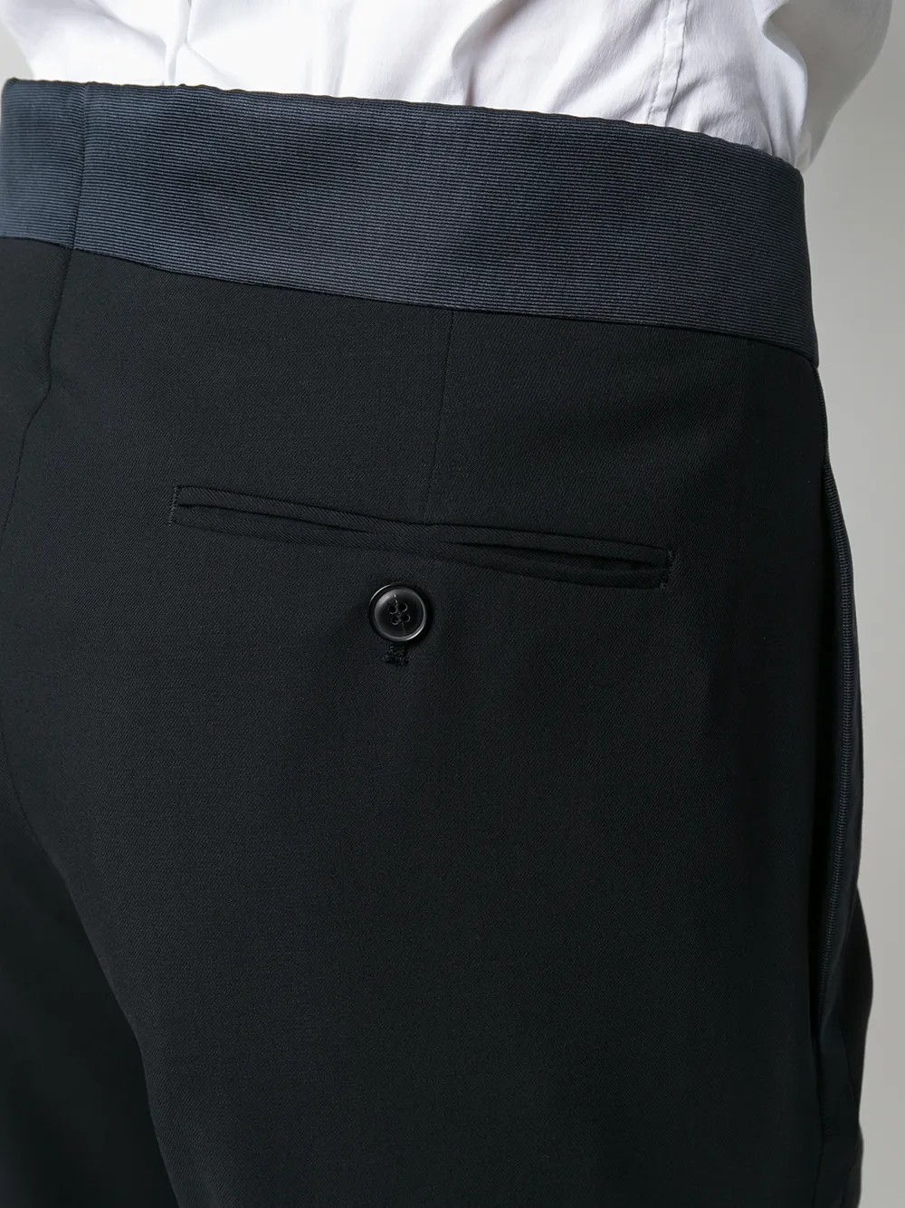 Костюм-двойка от Giorgio Armani (Джорджо Армани). Заостренные лацканы, застежка на пуговицах спереди, длинные рукава, нагрудный карман, передний карман с листочкой, манжеты на пуговицах, прямой подол, прямые брючины, полоски сбоку, задние карманы с листочкой на пуговицах и стандартная длина.