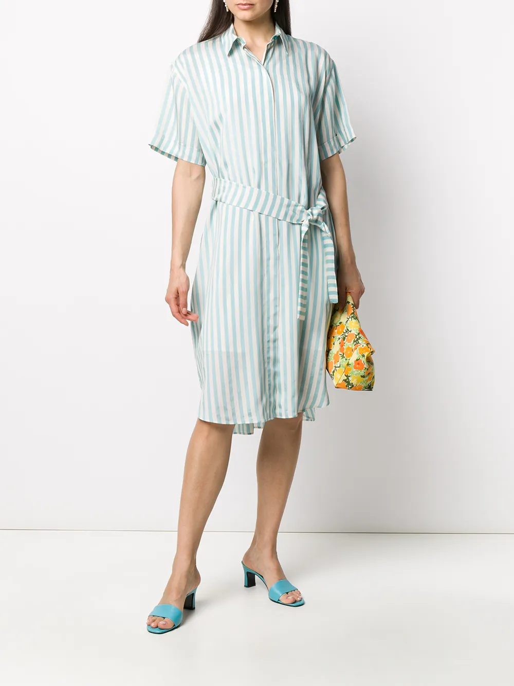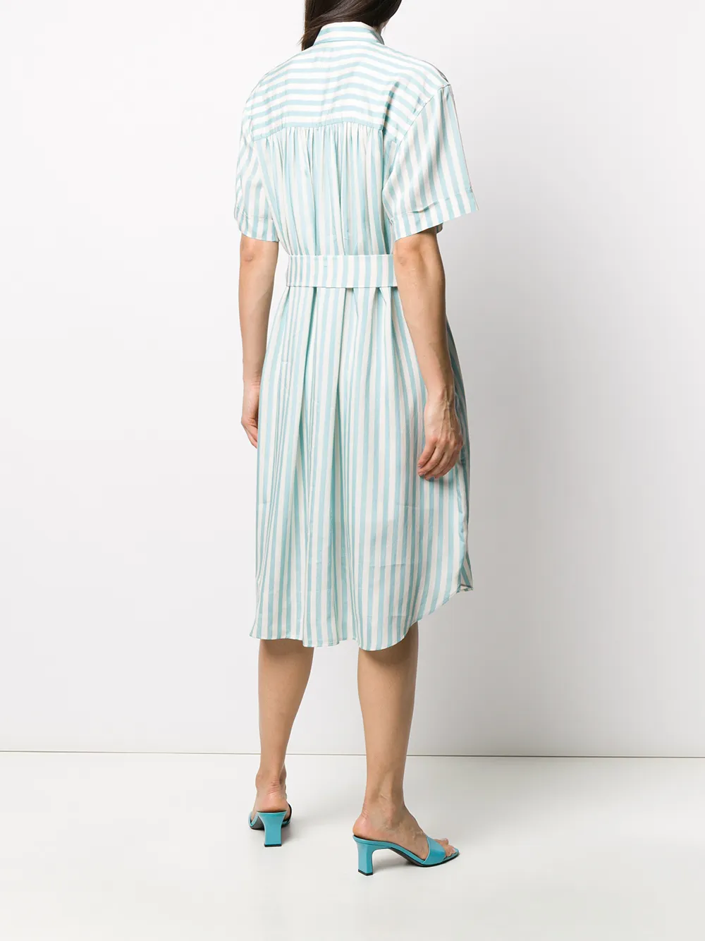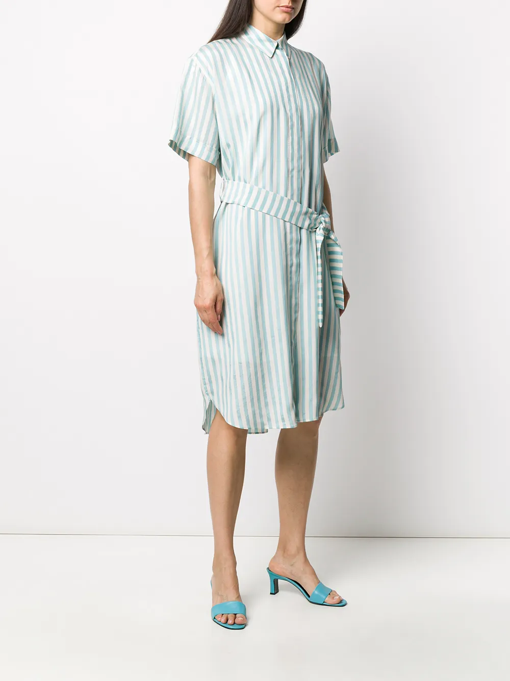 Платье-рубашка в полоску от PS Paul Smith. Узор в полоску, ремень на талии, классический воротник, короткие рукава и средней длины.