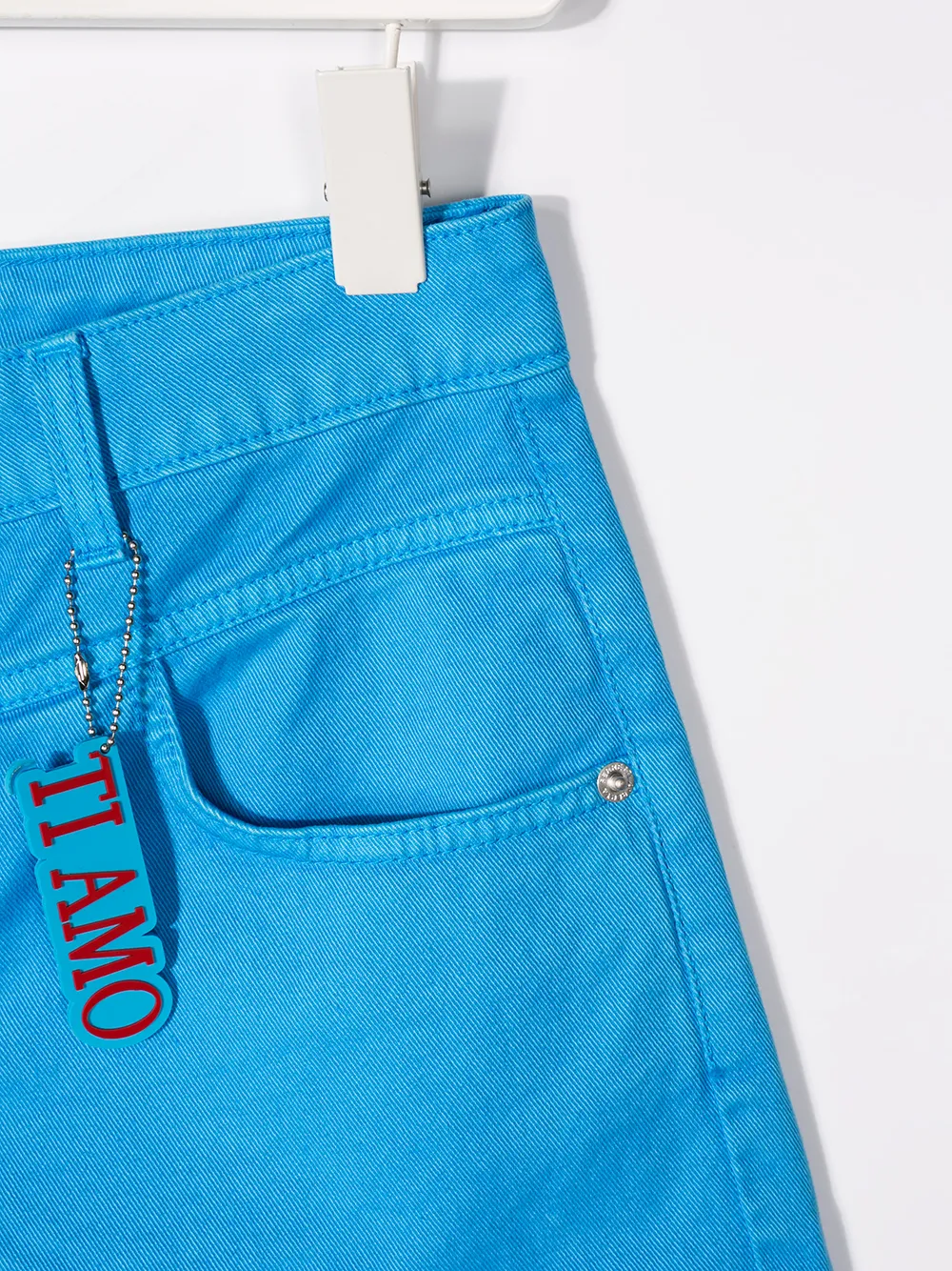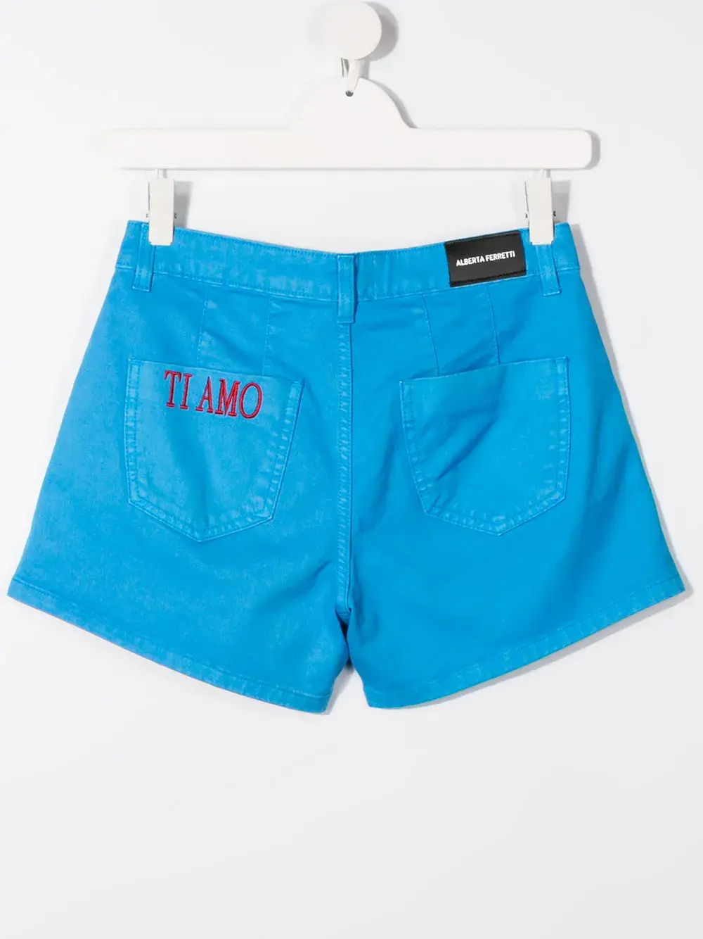 Шорты с логотипом от Alberta Ferretti Kids. Пояс с петлями для ремня, застежка на пуговице и молнии, классическая пятикарманная модель, металлическая фурнитура, вышитый логотип сзади и кожаная заплатка с логотипом сзади. Цвет: синий.