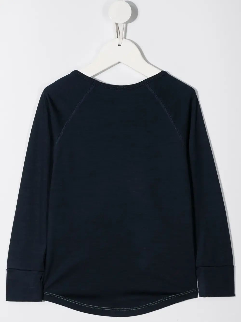 Круглый вырез, длинные рукава реглан и закругленный подол.
