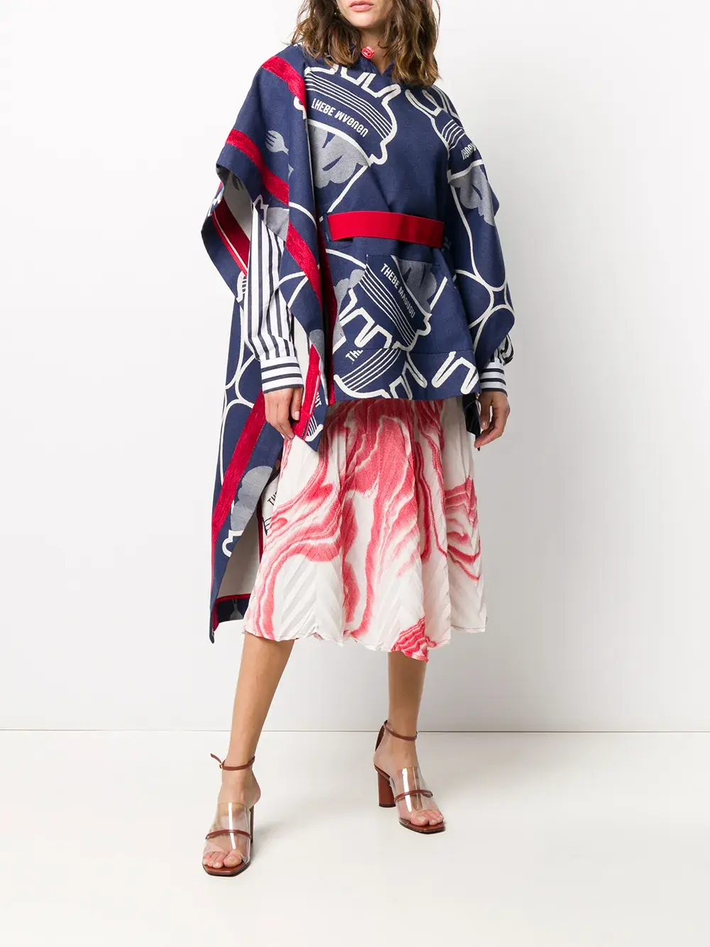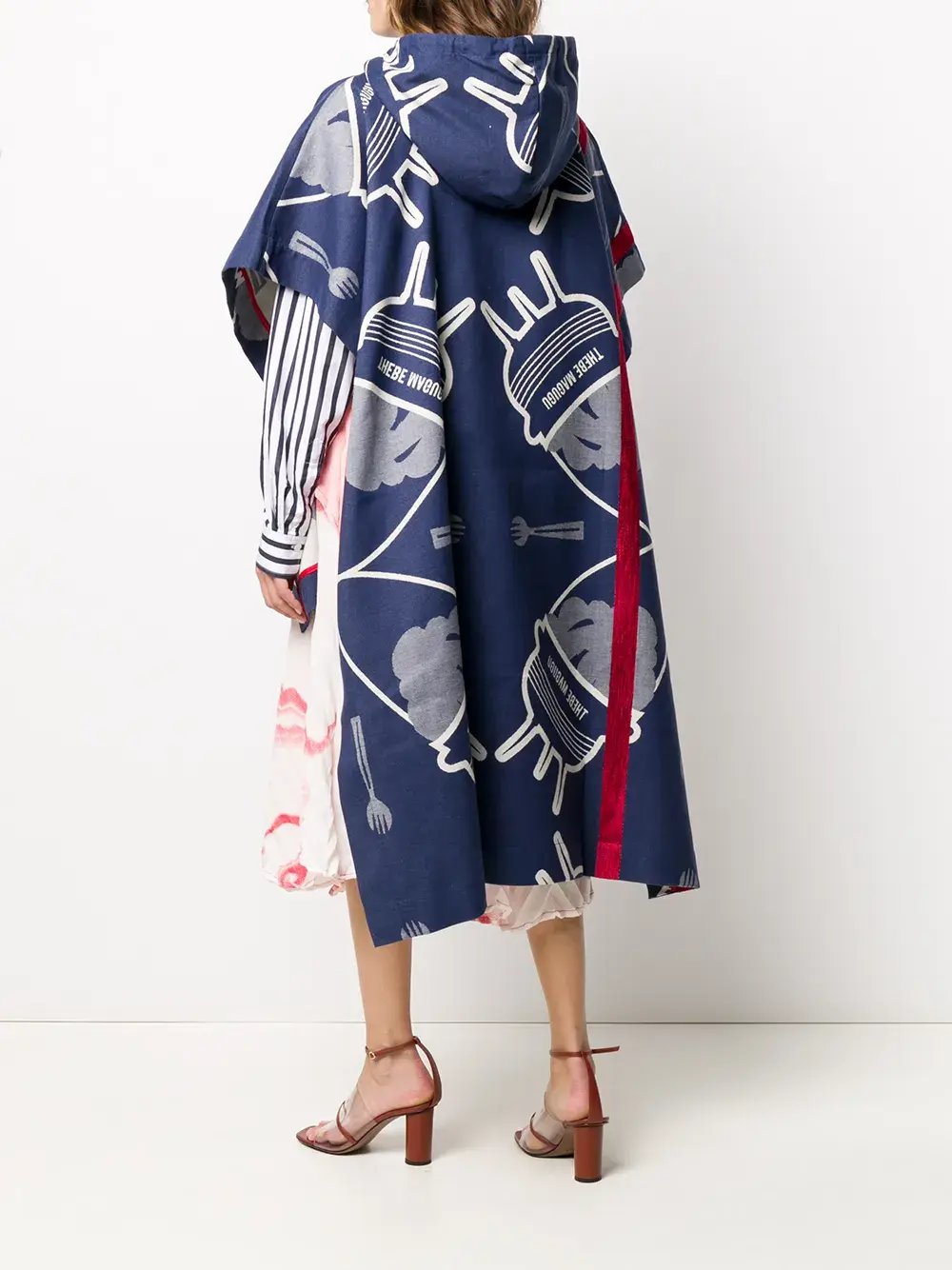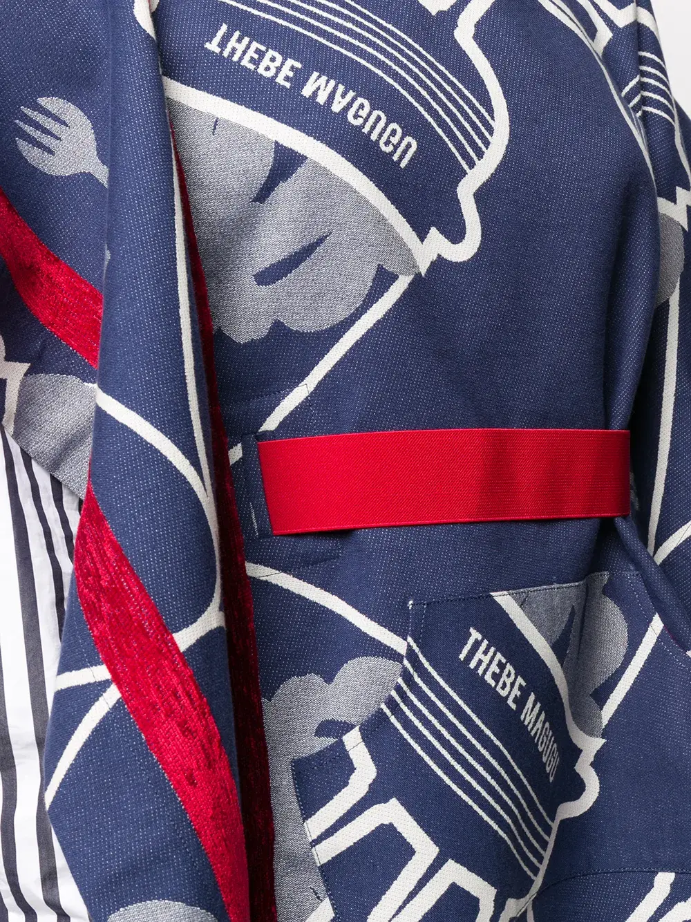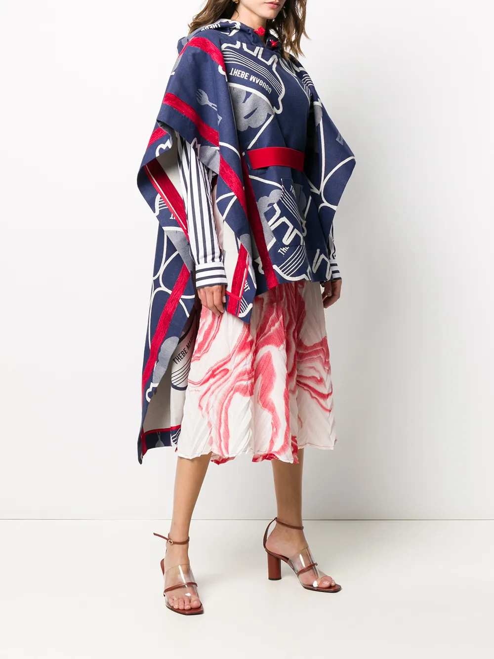 Кейп Basotho с принтом от Thebe Magugu. Капюшон, модель слип-он, без застежки, асимметричный подол, пояс на талии и геометрический принт.