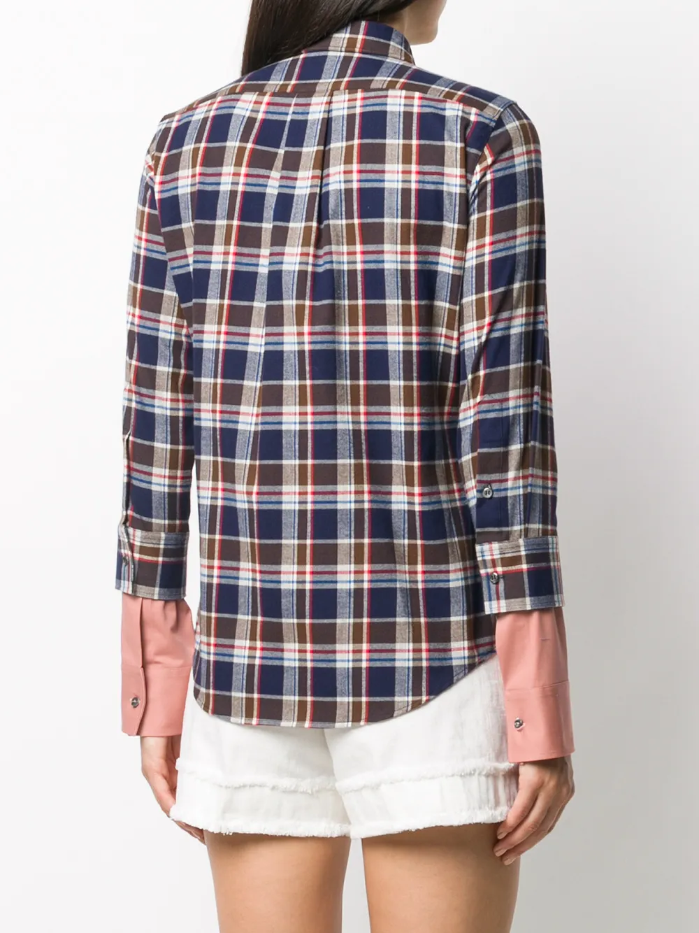 Клетчатый узор, классический воротник, потайная пуговичная застежка спереди и закругленный подол.