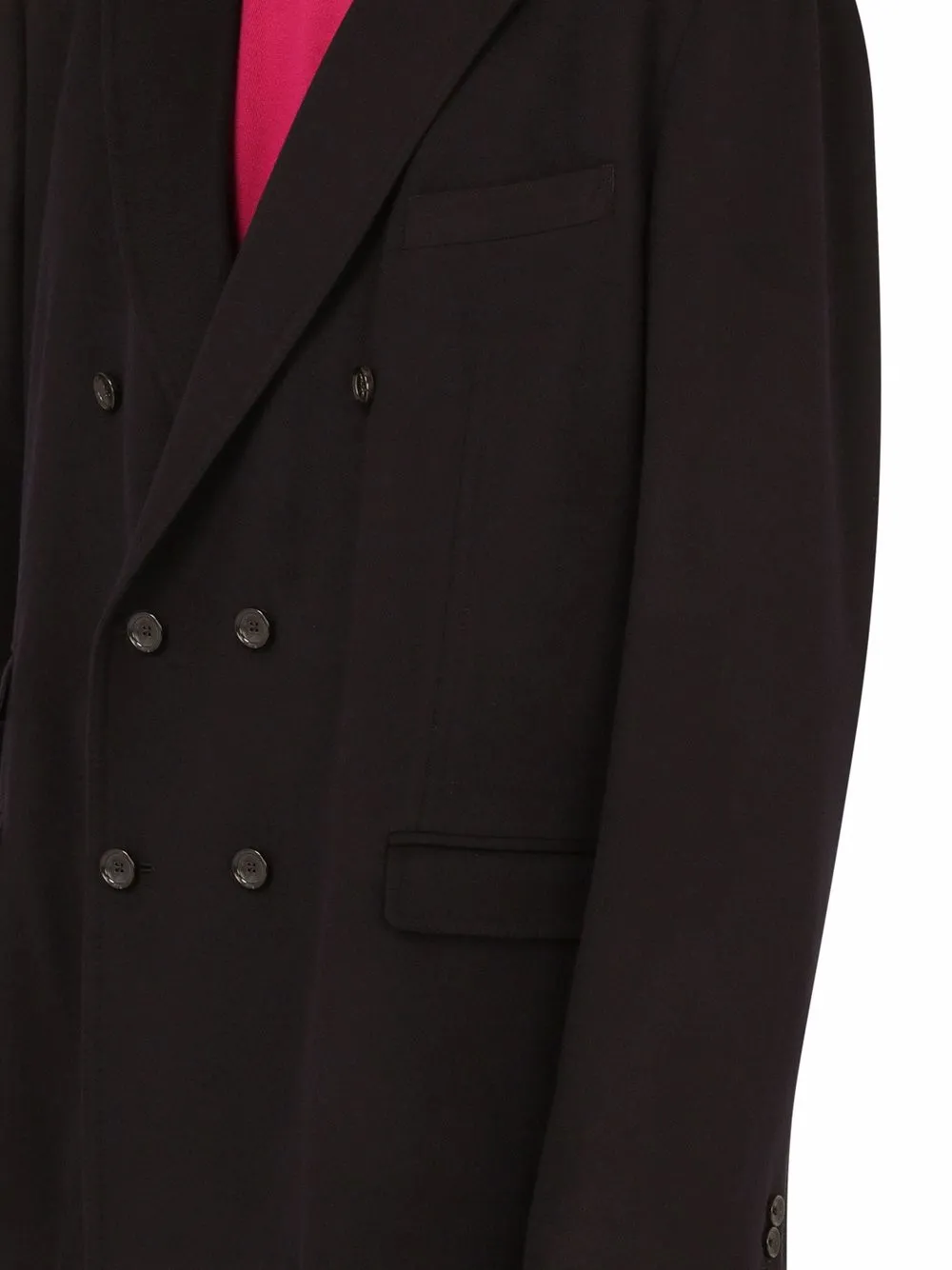 Заостренные лацканы, двубортная застежка на пуговицы, длинные рукава, манжеты на пуговицах, нагрудный прорезной карман, два передних кармана с клапанами, шлица по центру сзади, прямой подол и шелковая подкладка.