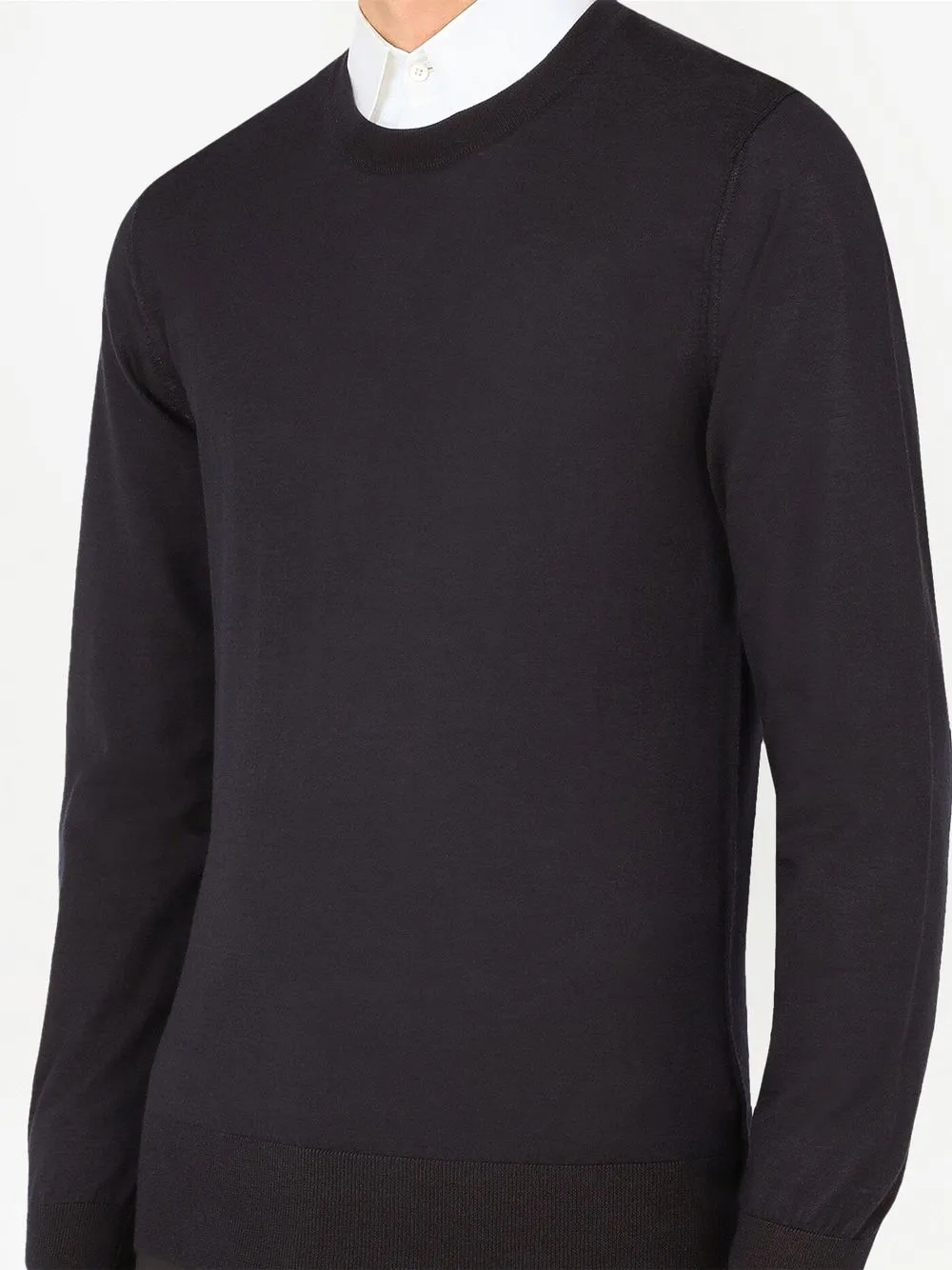 Темно-синий, кашемир, круглый вырез, длинные рукава, прямой подол и отделка в рубчик.