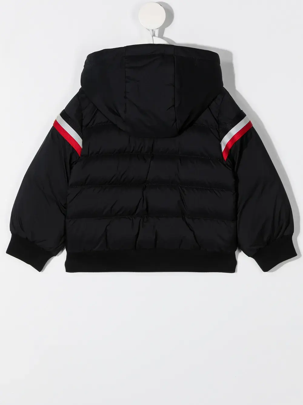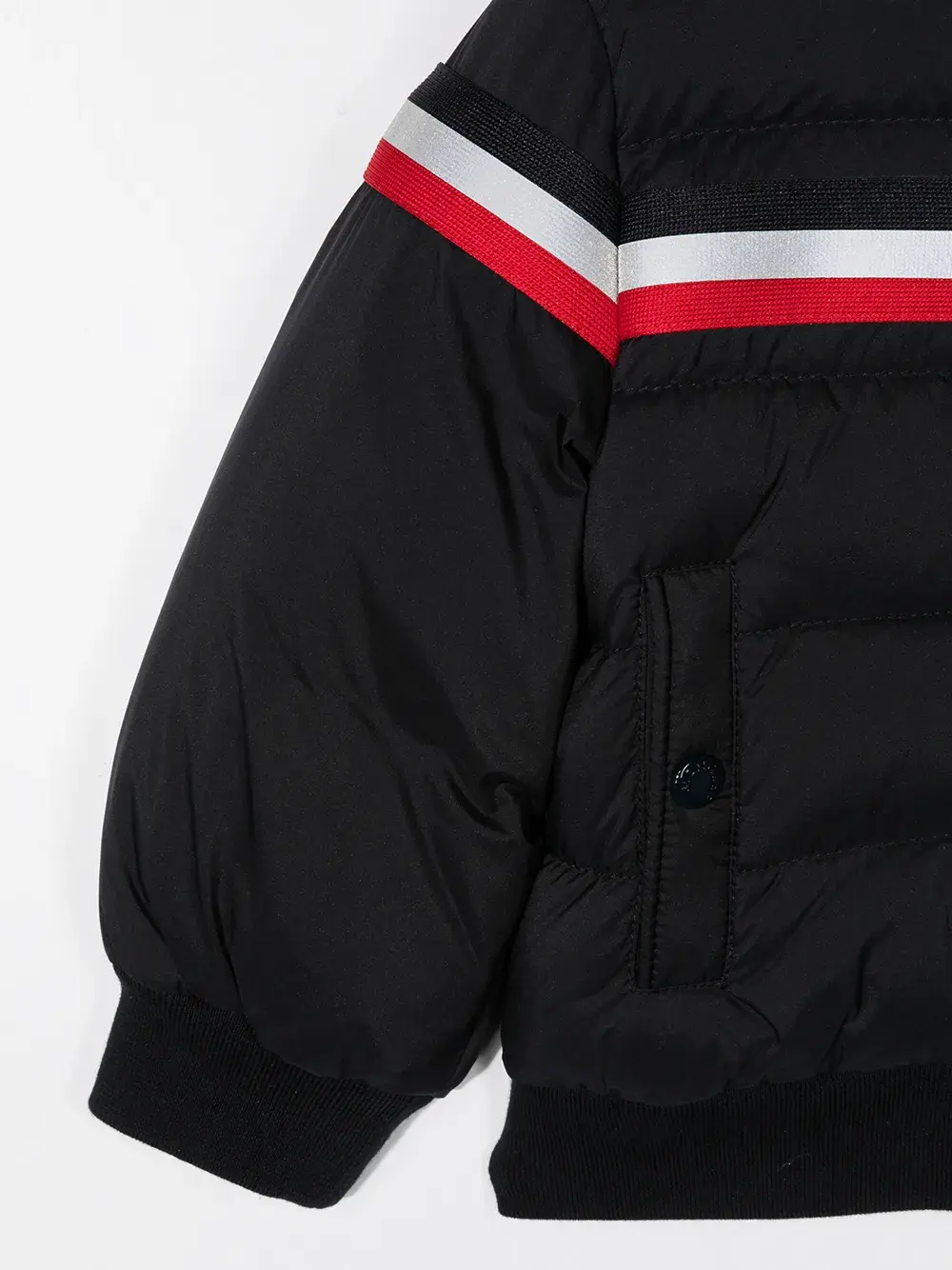 Дутый материал, полоски, нашивка с логотипом на рукаве, классический капюшон, застежка на молнии спереди, два передних кармана с листочкой, длинные рукава, манжеты в рубчик и подол в рубчик.