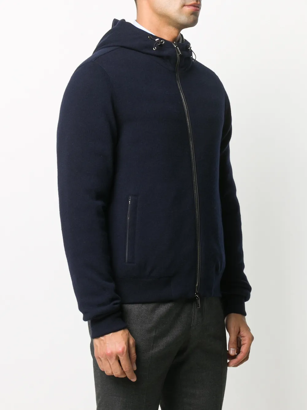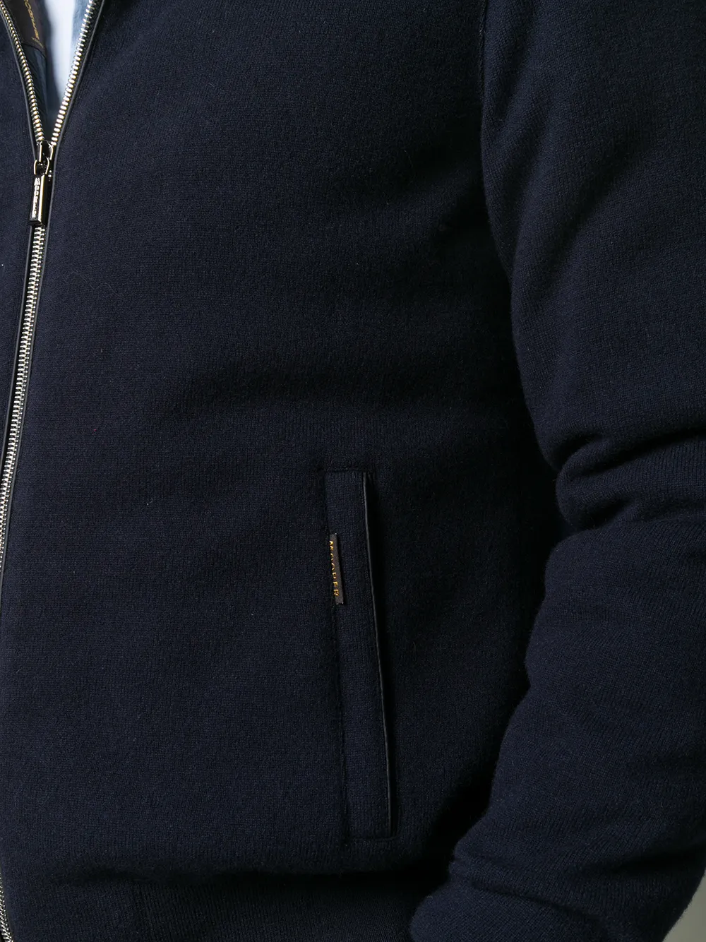 Тонкая вязка, воротник-стойка, застежка на молнии спереди, длинные рукава, рукава с узкими манжетами и два кармана на молнии по бокам.