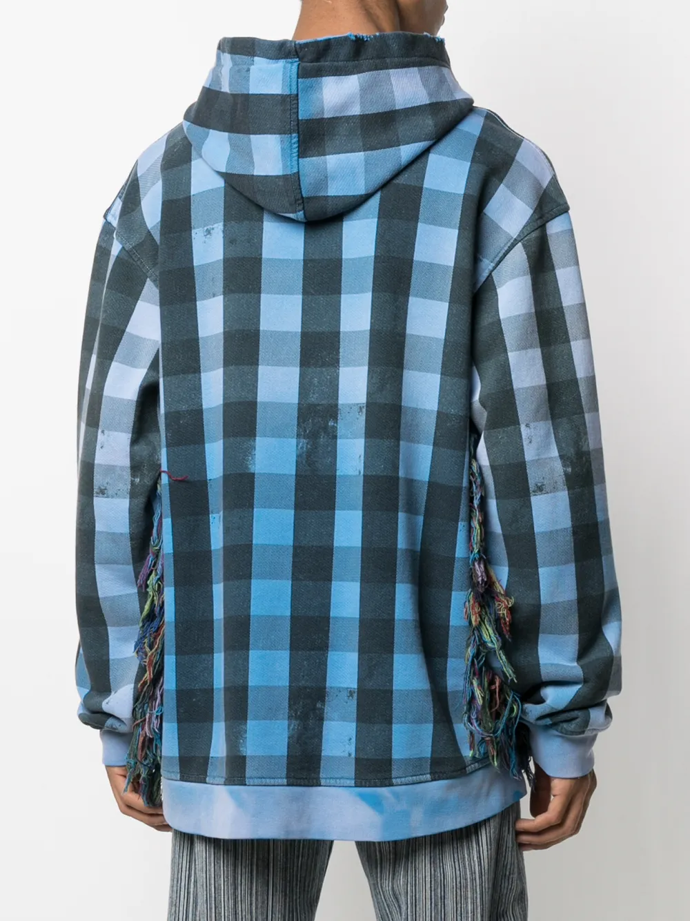 Классический капюшон, принт в клетку, длинные рукава, бахрома и свободный крой.