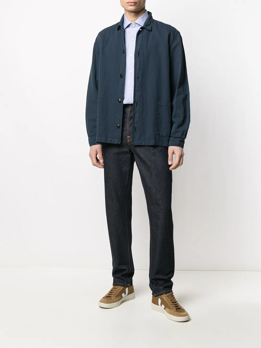 Вышитый логотип на груди, планка на пуговицах спереди, классический воротник, длинные рукава, манжеты на пуговицах и закругленный подол. Цвет: синий.
