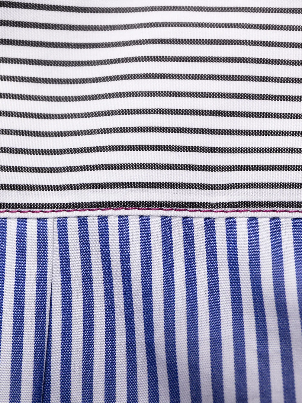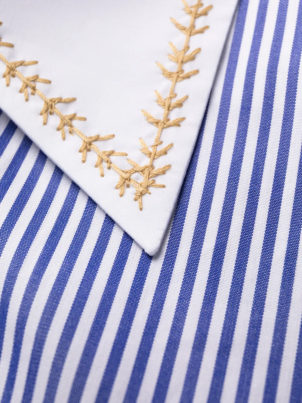 Вышивка, узор в тонкую полоску, классический воротник, застежка на пуговицах спереди, длинные рукава и кулиска на талии.