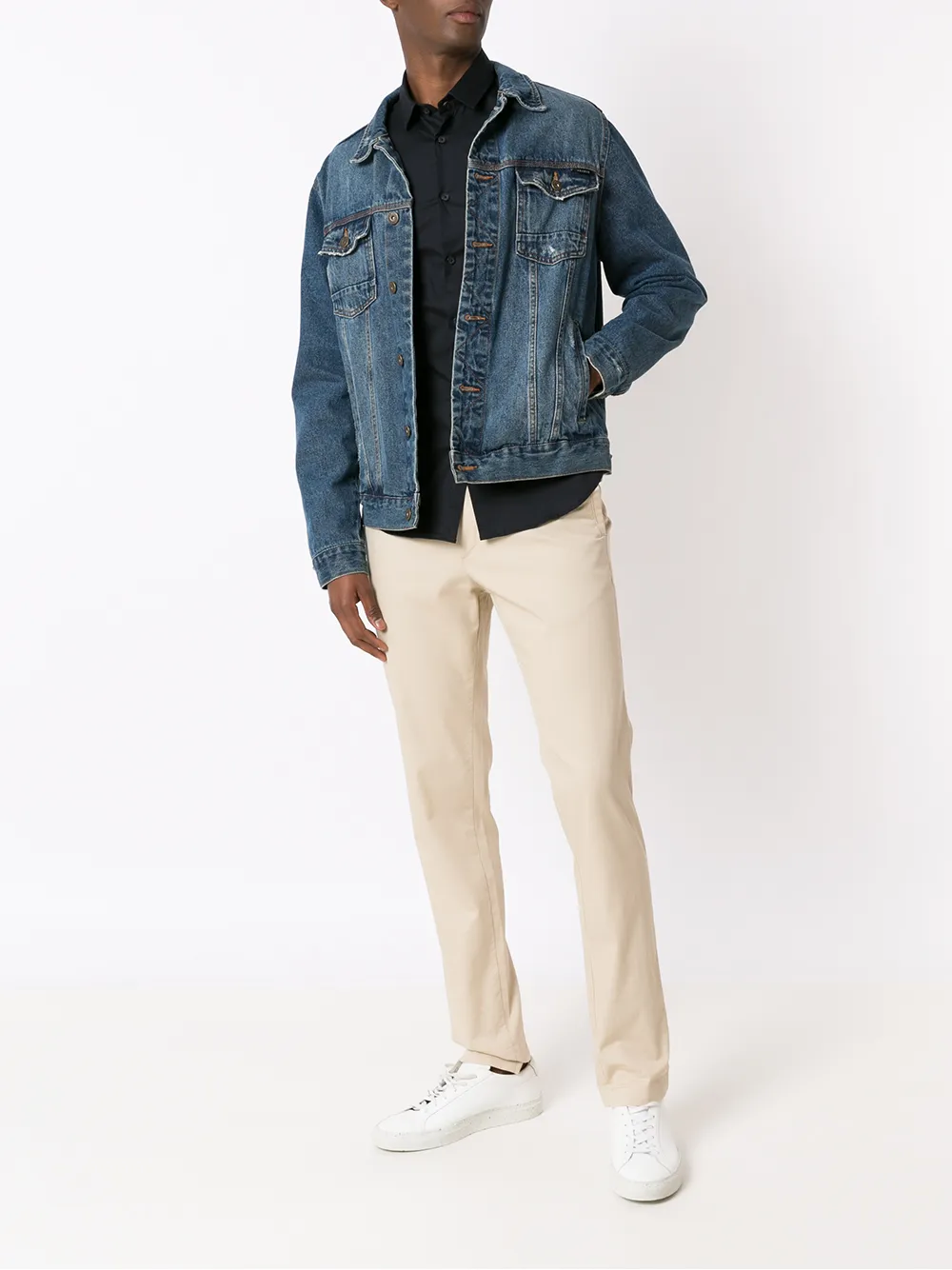 Вышитый логотип на груди, классический воротник, застежка на пуговицах спереди, длинные рукава, манжеты на пуговицах и закругленный подол.