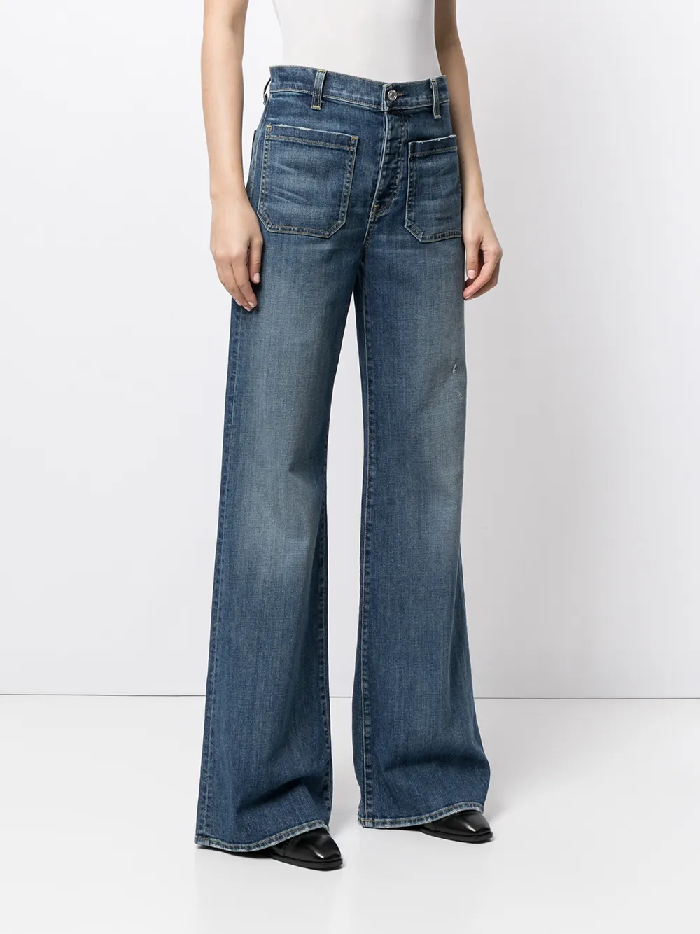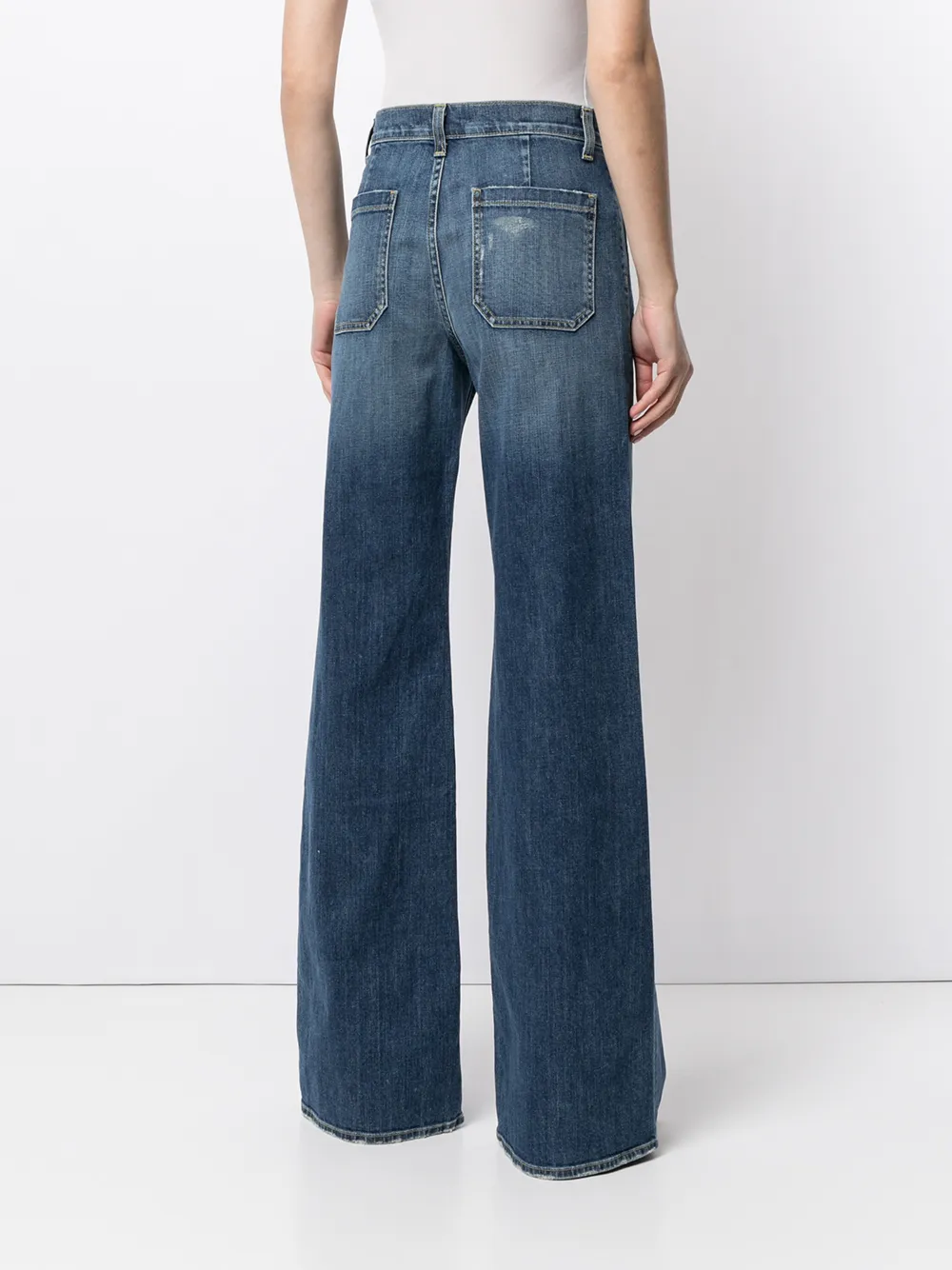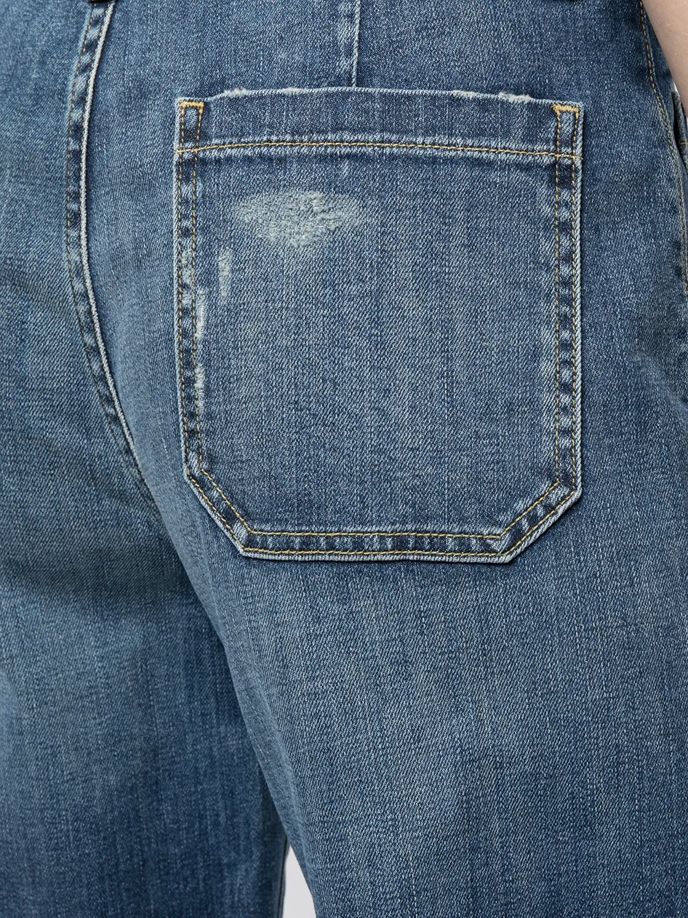 Эффект потертости, средняя посадка, петли для ремня, застежка на молнии и пуговице спереди, два накладных кармана спереди, два накладных кармана сзади, свободный крой и длина макси. Цвет: синий.