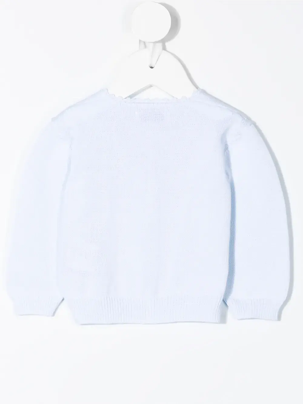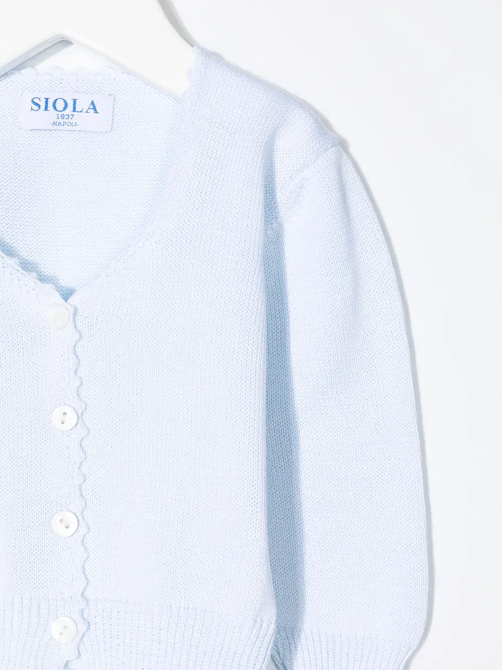 Вязаный дизайн, края с фестонами, застежка на пуговицах спереди, длинные рукава, манжеты в рубчик и подол в рубчик. Цвет: синий.