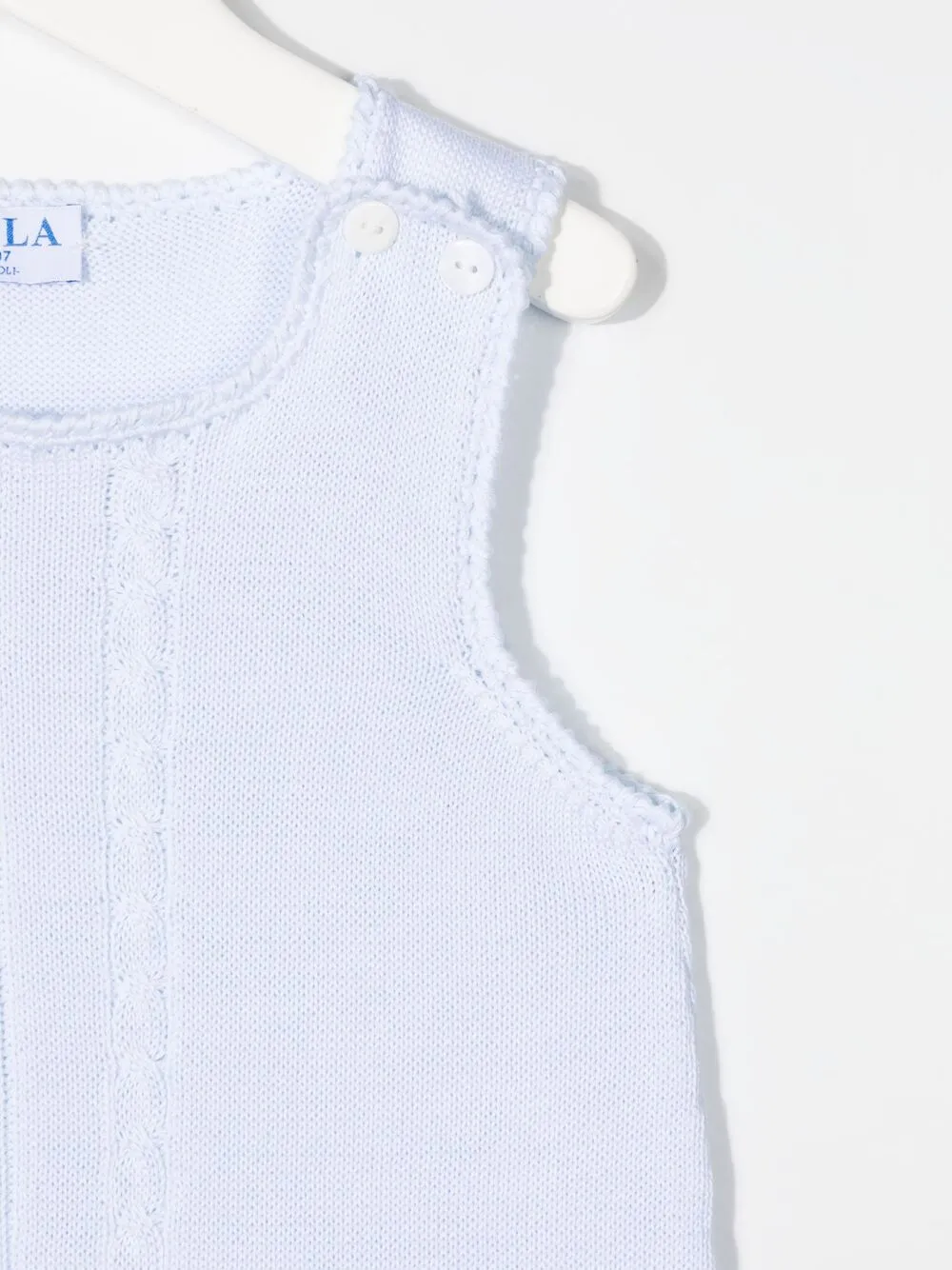 Фактурная вязка, пуговичные застежки на плечах, без рукавов и круглый вырез.