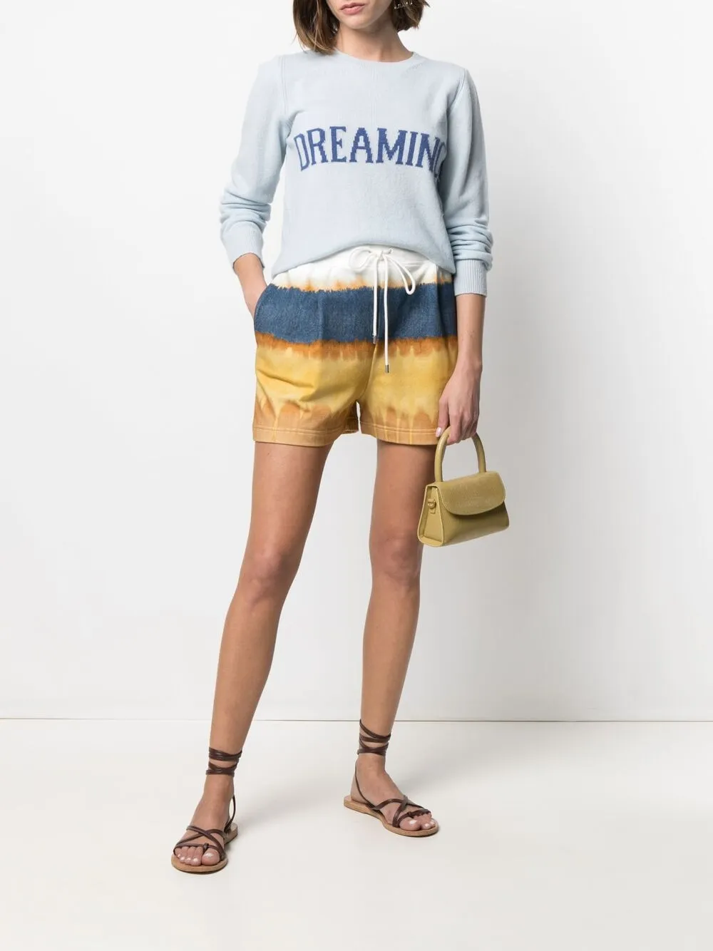 Принт тай-дай, кулиска на талии и эластичный пояс.