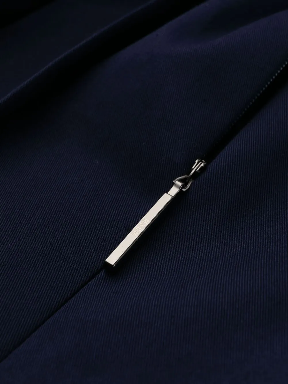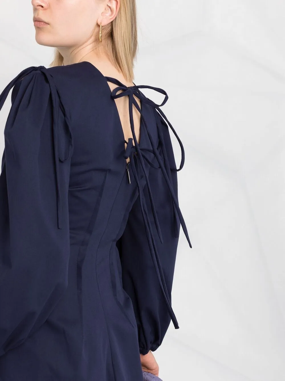 Однотонная расцветка, круглый вырез, длинные рукава, эластичные манжеты, вырезные детали, бант, защипы, А-образный силуэт и застежка на молнии сзади. Цвет: синий.