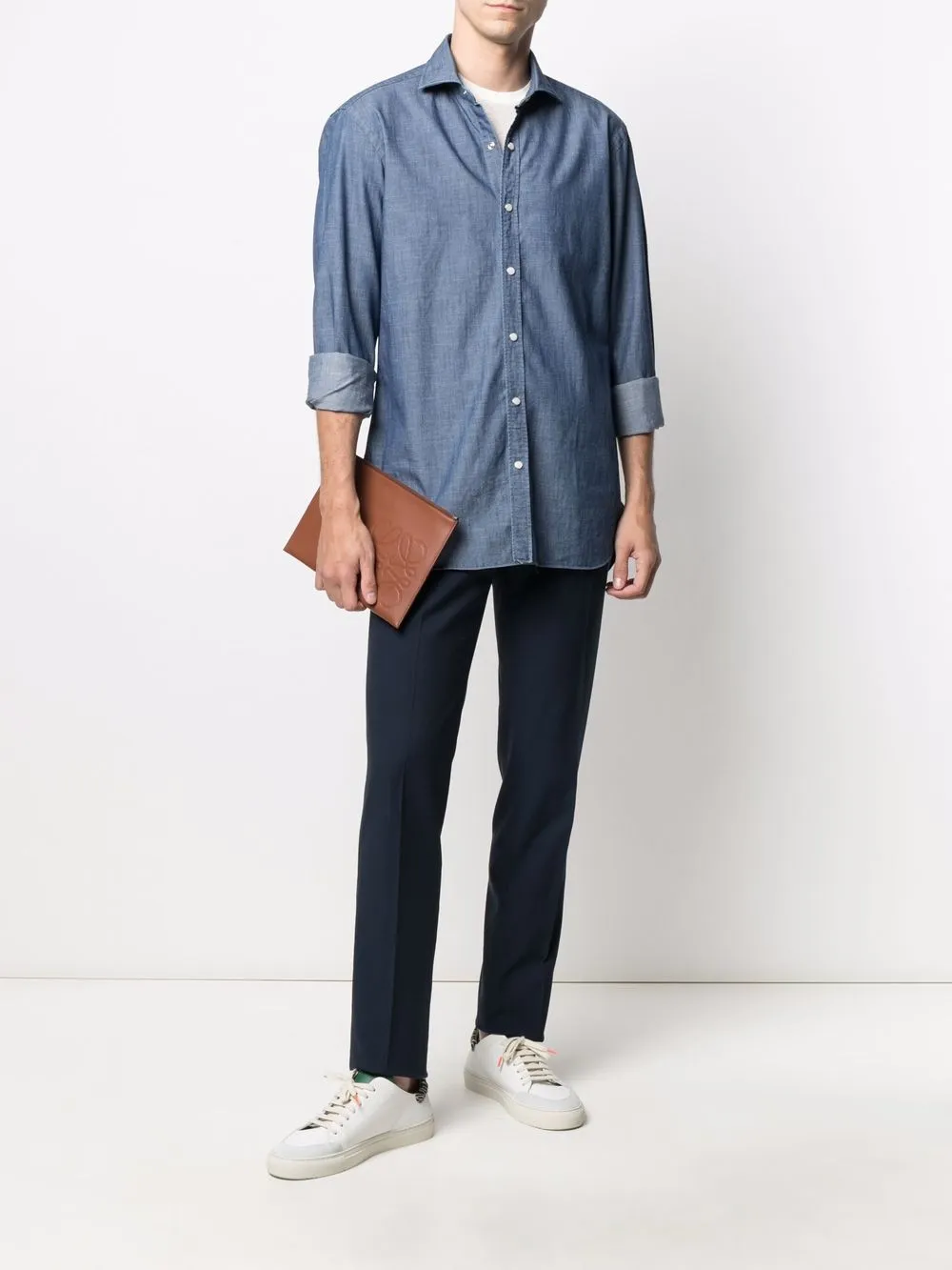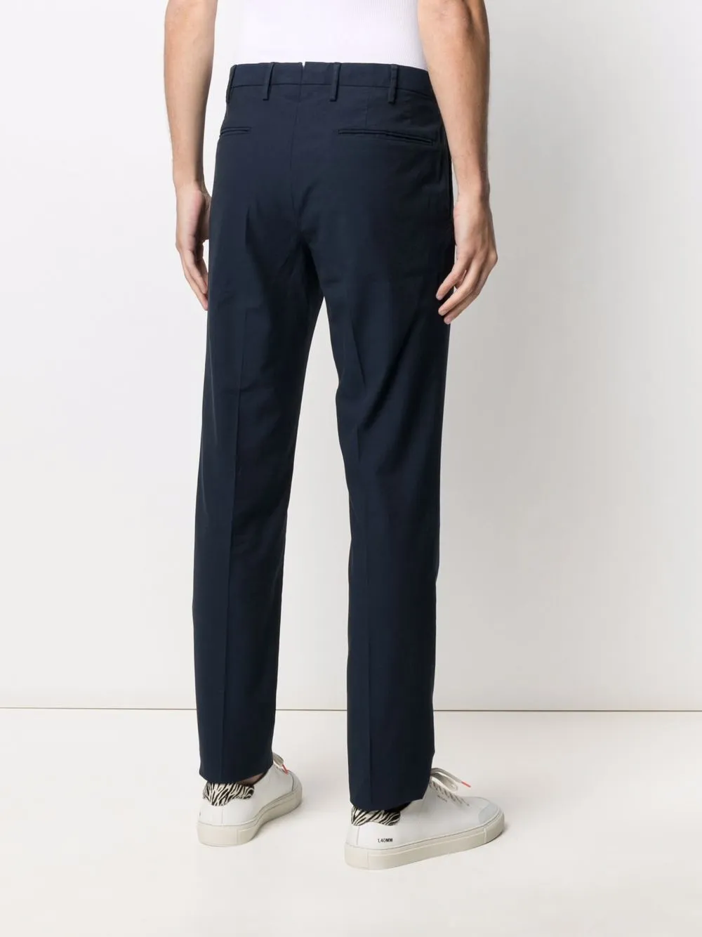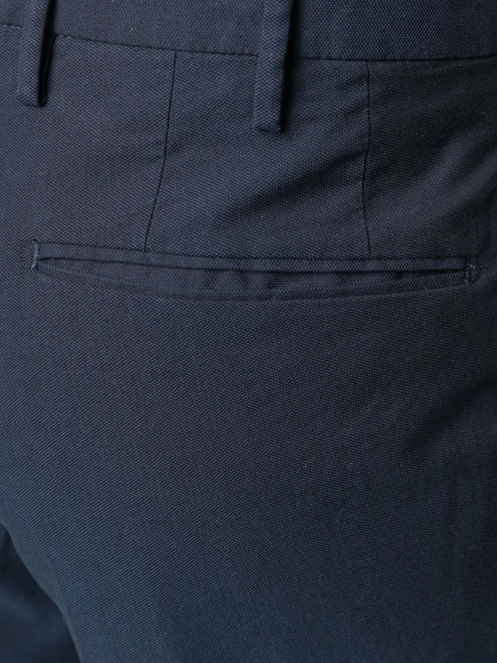 Средняя посадка, ширинка на пуговицах, петли для ремня, два прорезных кармана по бокам, два кармана с листочкой сзади и строгий крой.