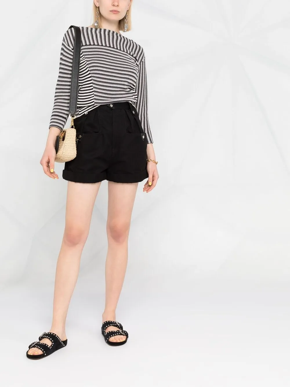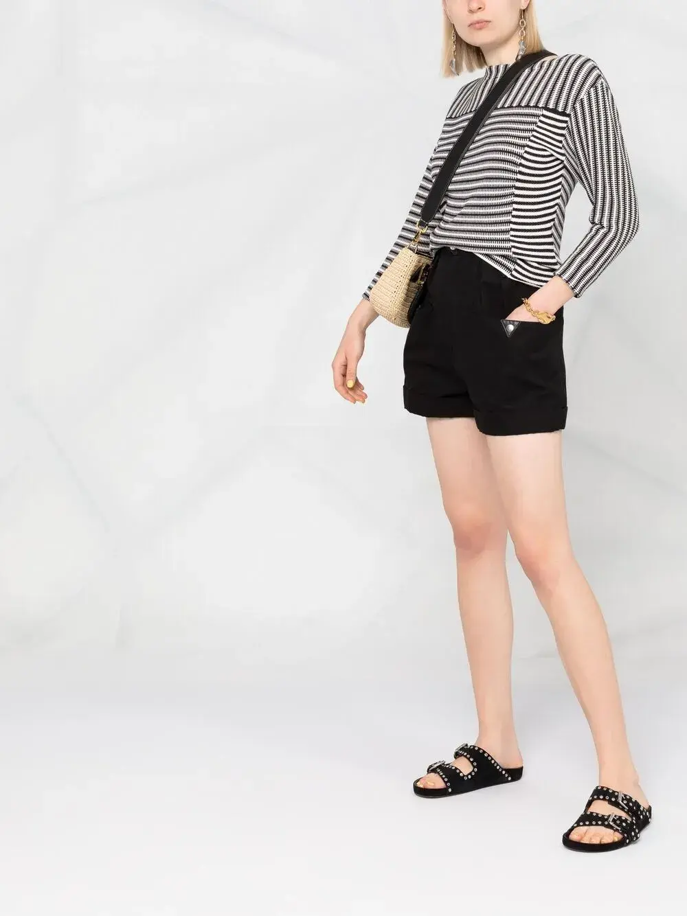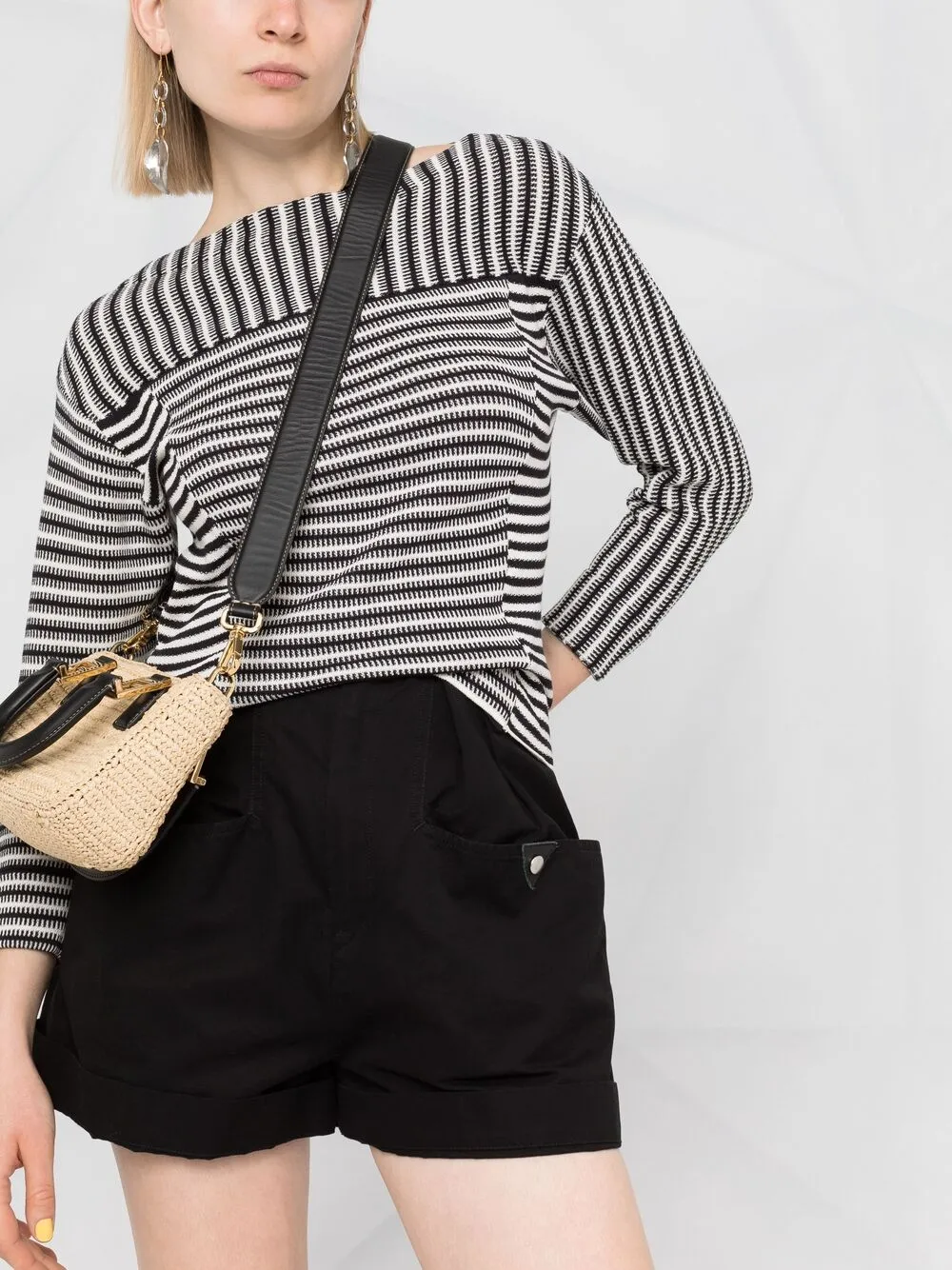 Узор в горизонтальную полоску, вставки, вырез-лодочка и рукава три четверти.