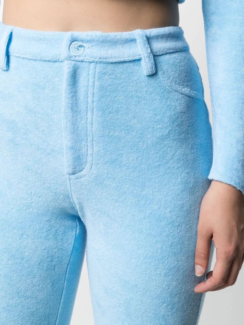 Завышенная талия, петли для ремня, застежка на молнии и пуговице спереди, имитация кармана, два накладных кармана сзади и прямой крой.