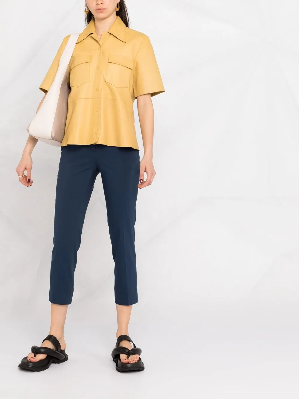 Два вшитых кармана по бокам, застежка на молнию и крючок, петли для ремня, узкий крой и укороченная длина.