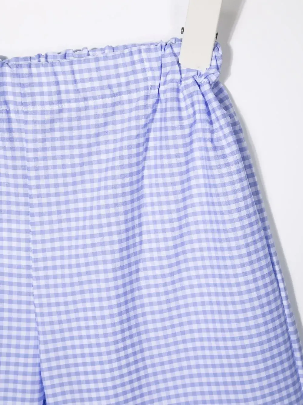 Принт в клетку, эластичный пояс, модель без застежки, длина по колено и подвороты.