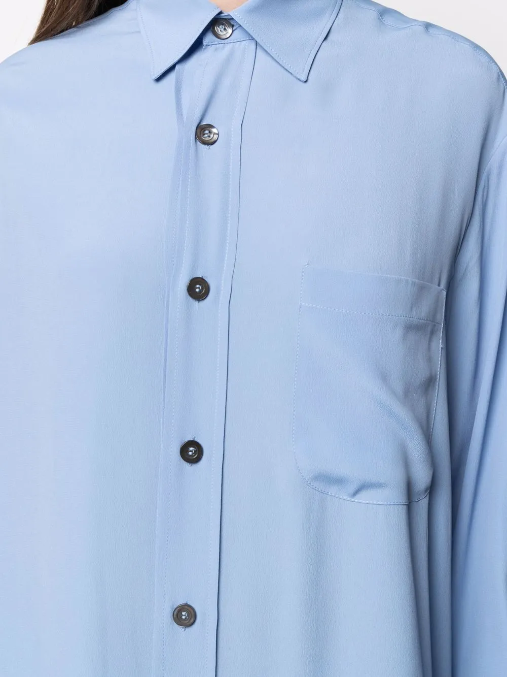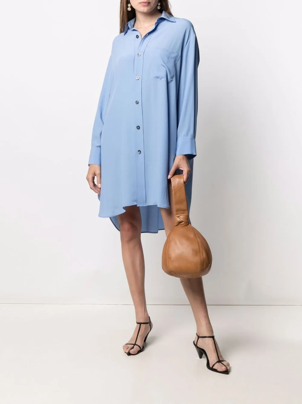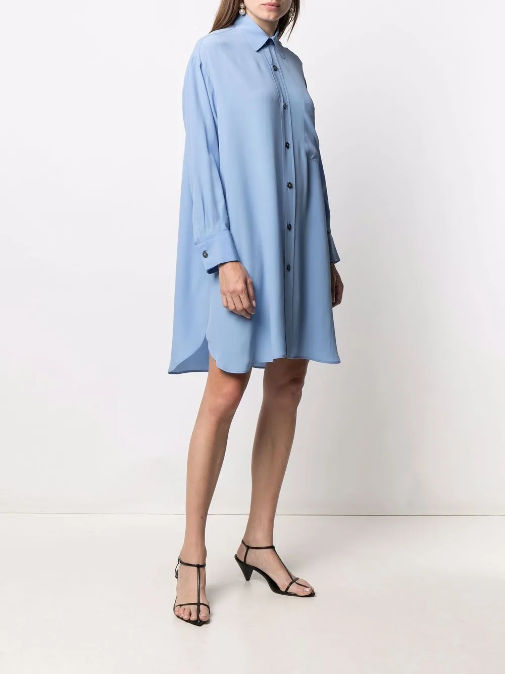 Нагрудный накладной карман, планка на пуговицах спереди, манжеты на пуговицах, классический воротник, длинные рукава и расклешенный крой.