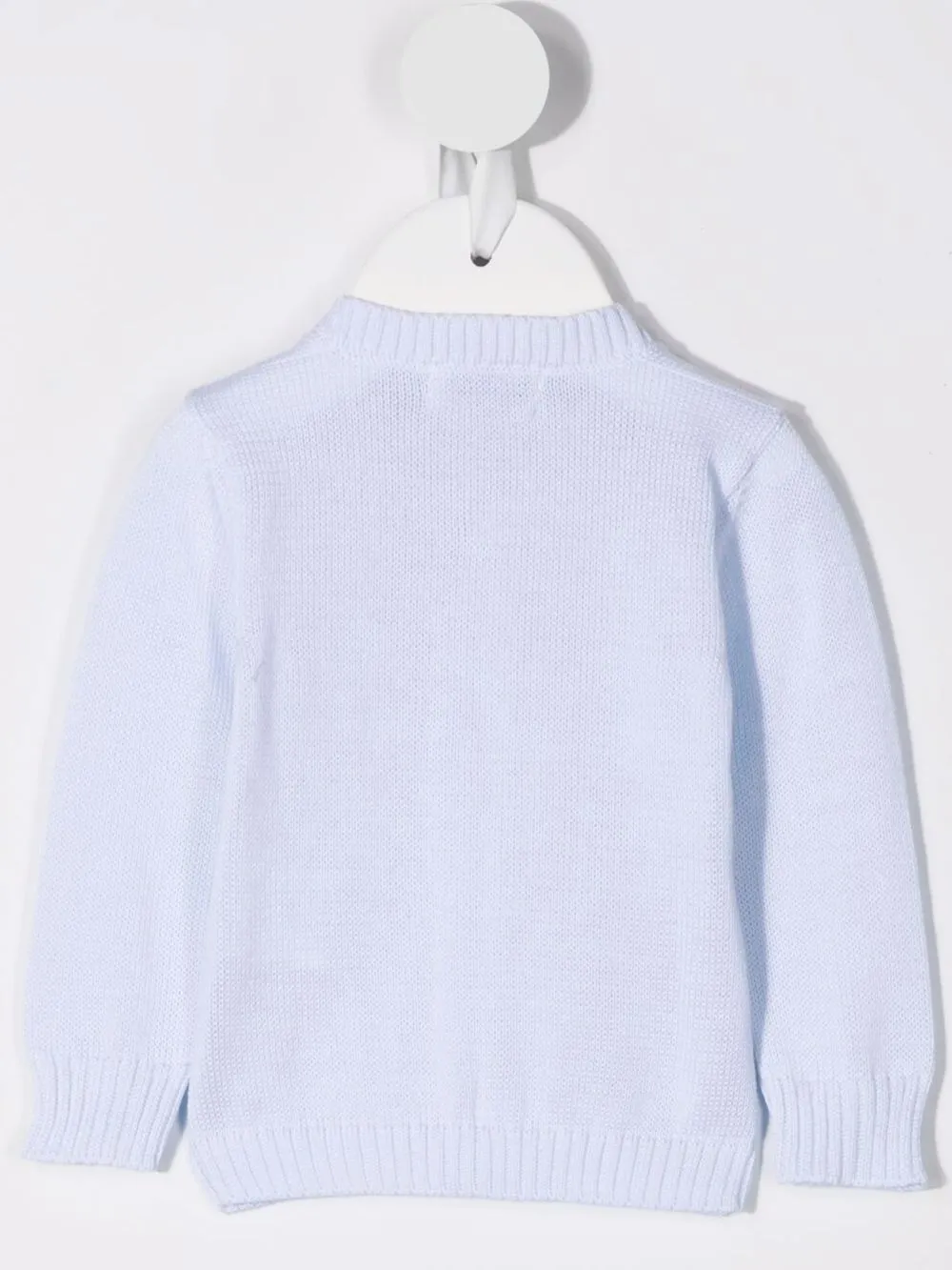 Края в рубчик, трикотажный материал, круглый вырез, застежка на пуговицах спереди и длинные рукава.