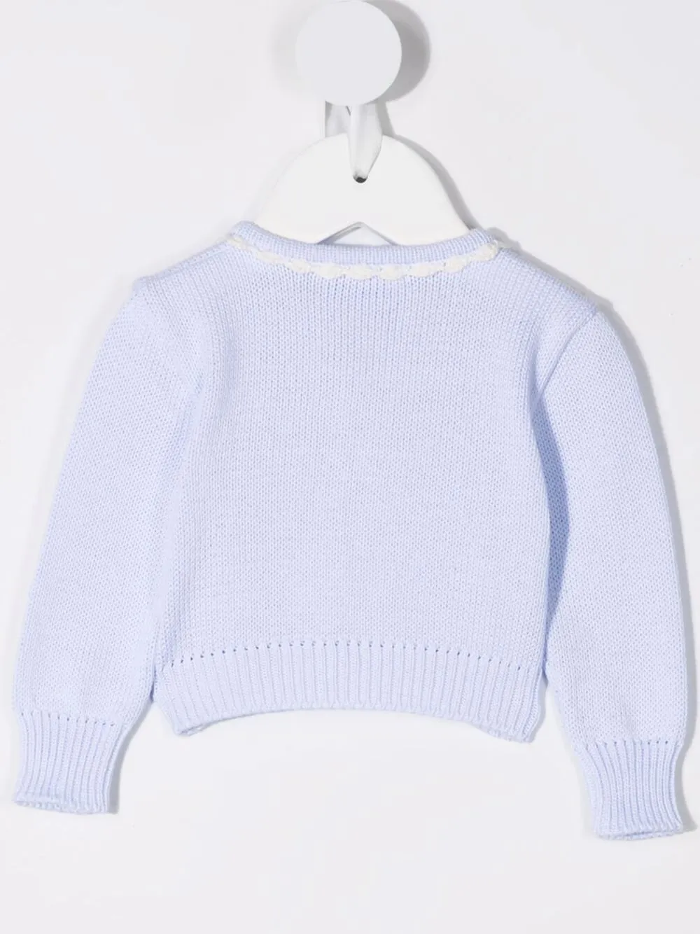 Вышивка, трикотажный материал, края в рубчик, круглый вырез, застежка на пуговицах спереди и длинные рукава.