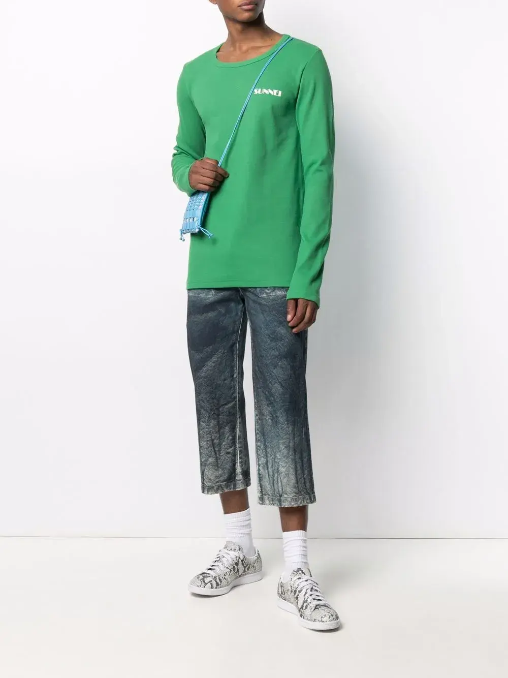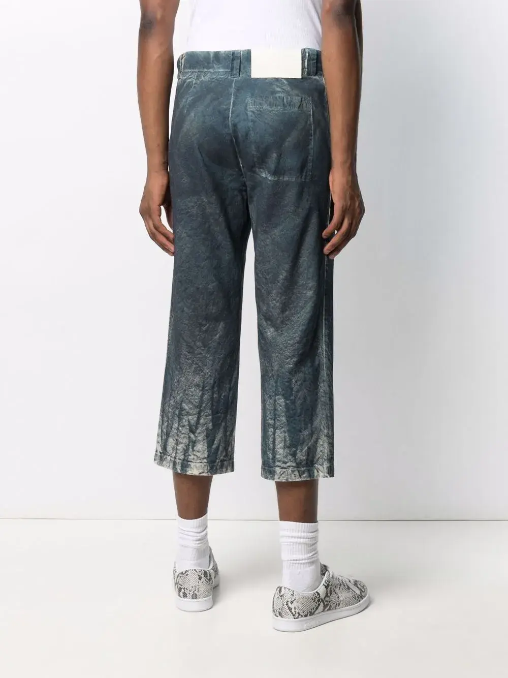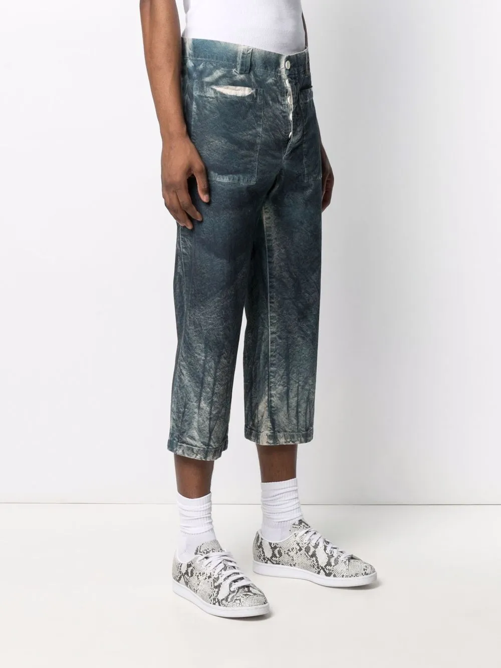 Эффект обесцвечивания, застежка на молнии и пуговице спереди, укороченная длина, два накладных кармана спереди и карман с клапаном сзади.