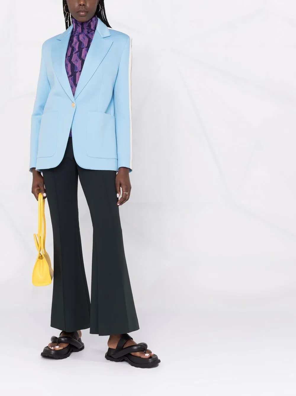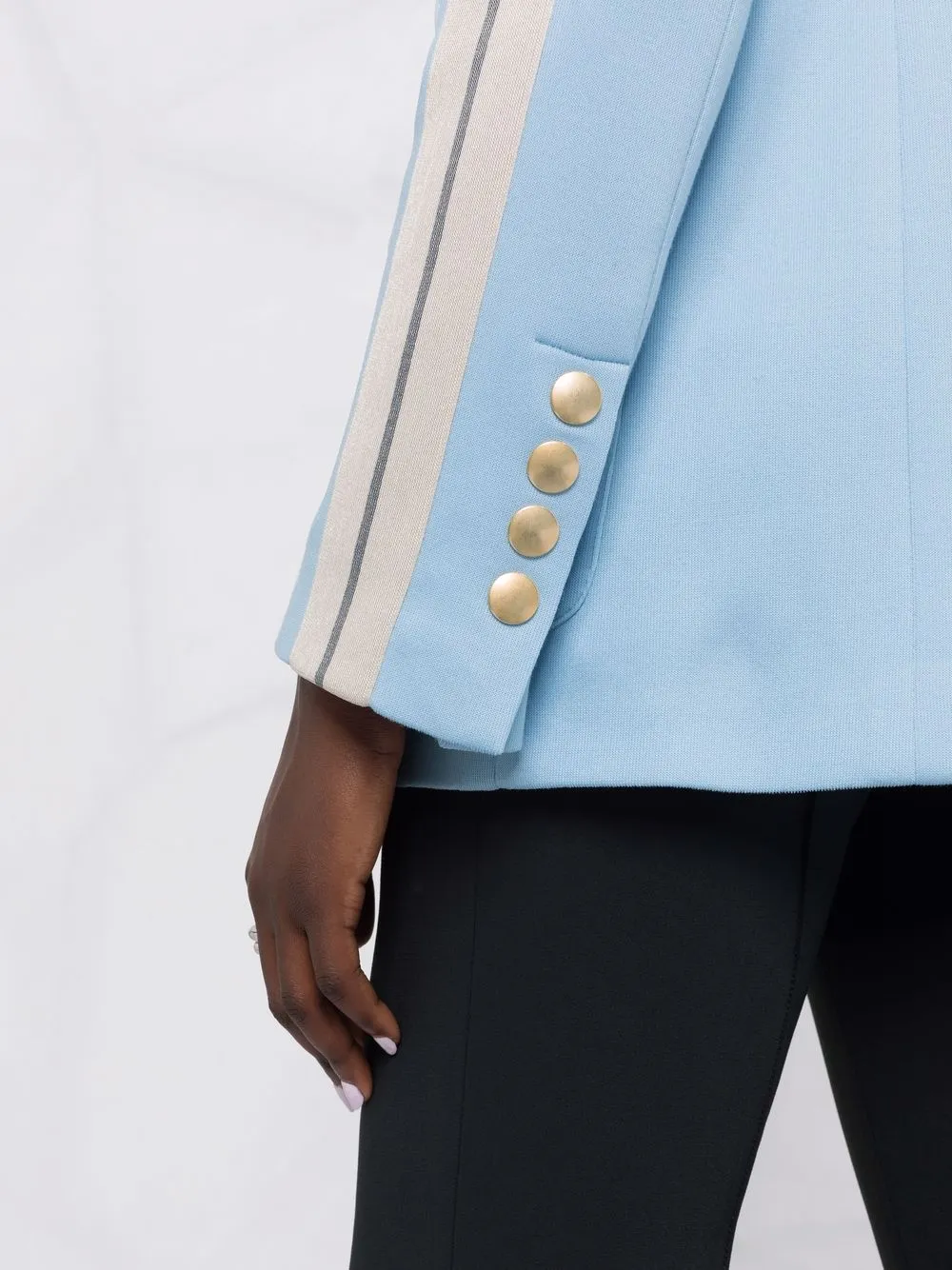 Полоска сбоку, зазубренные лацканы, застежка на пуговицах спереди, длинные рукава, манжеты на пуговицах, два накладных кармана спереди и шлица по центру сзади.