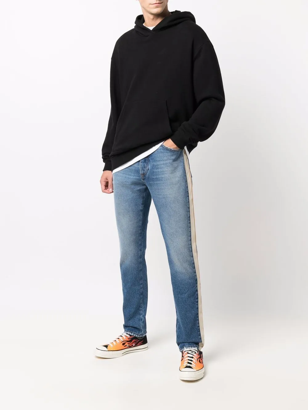 Полоска сбоку, нашивка с логотипом сзади, петли для ремня, застежка на молнии и пуговице спереди, классическая пятикарманная модель и прямой крой.