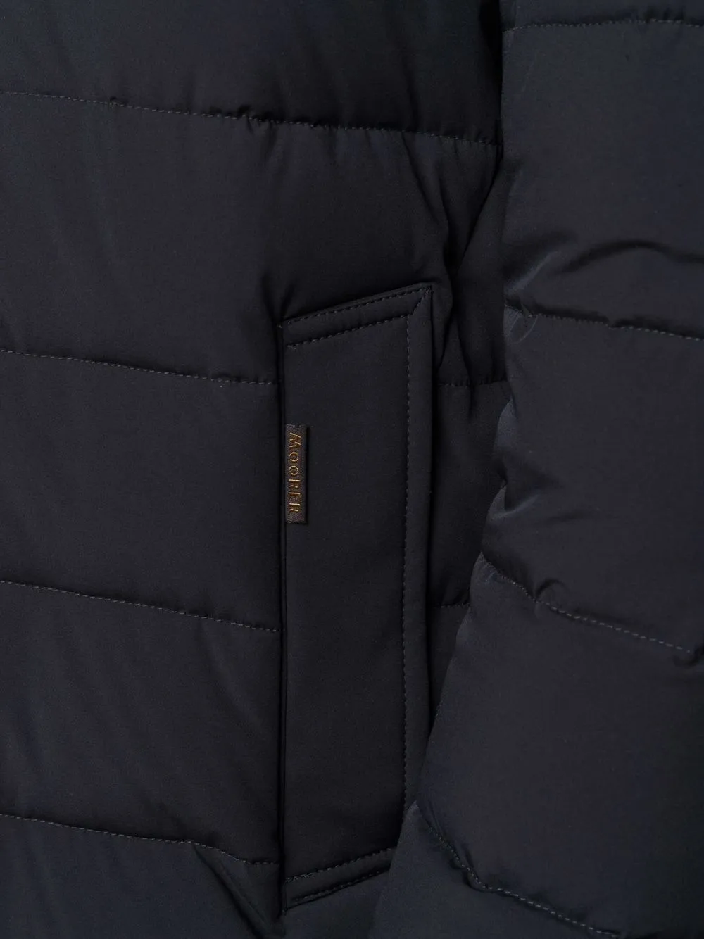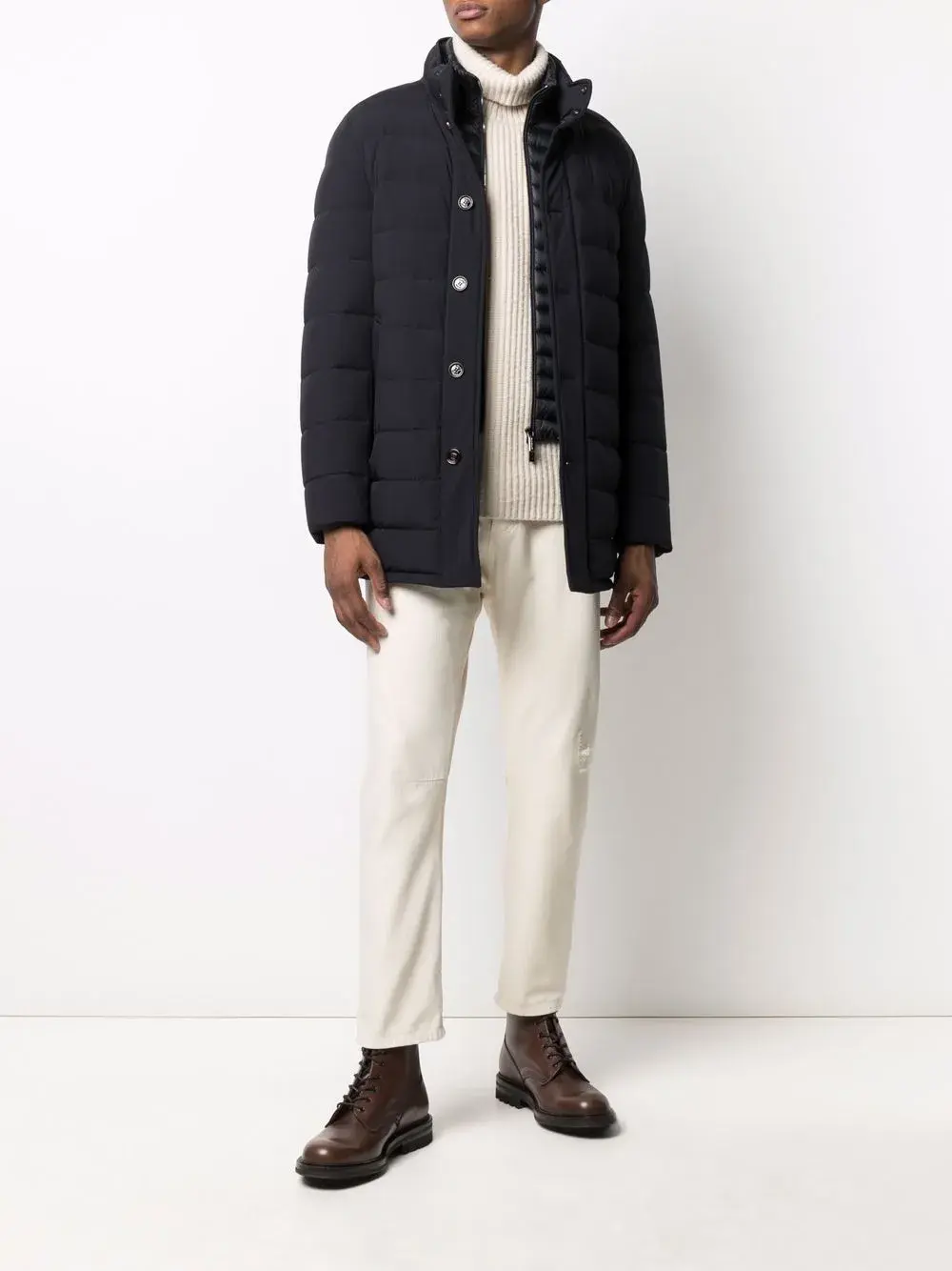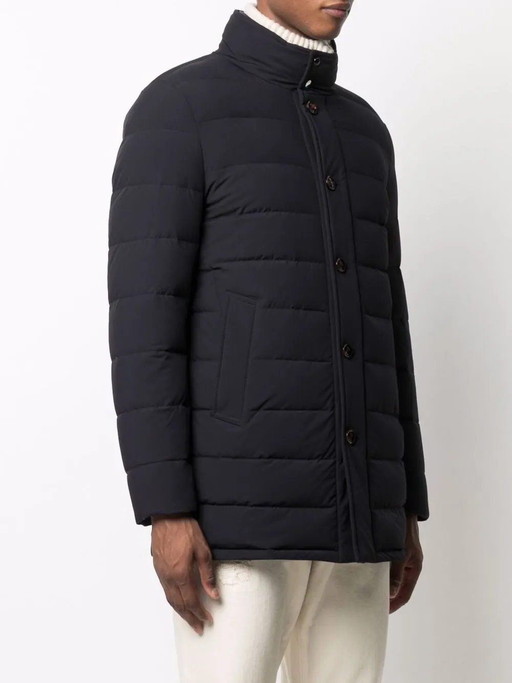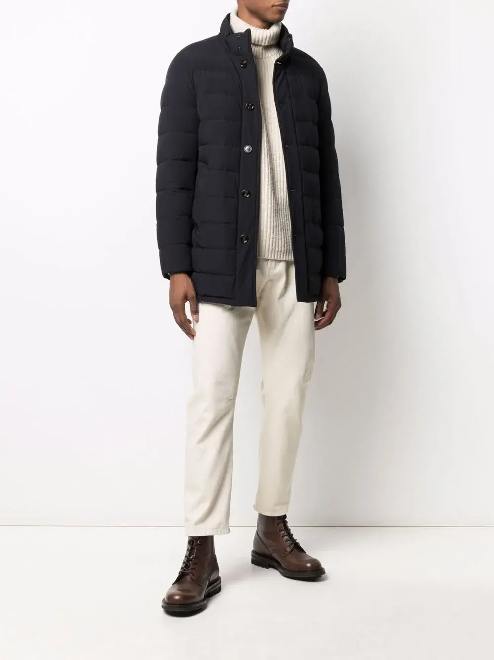 Многослойная деталь, дутый материал, наполнитель из смеси пуха и пера, стеганая отделка, высокий воротник, застежка на пуговицах спереди, длинные рукава, два кармана по бокам и шлица по центру сзади.