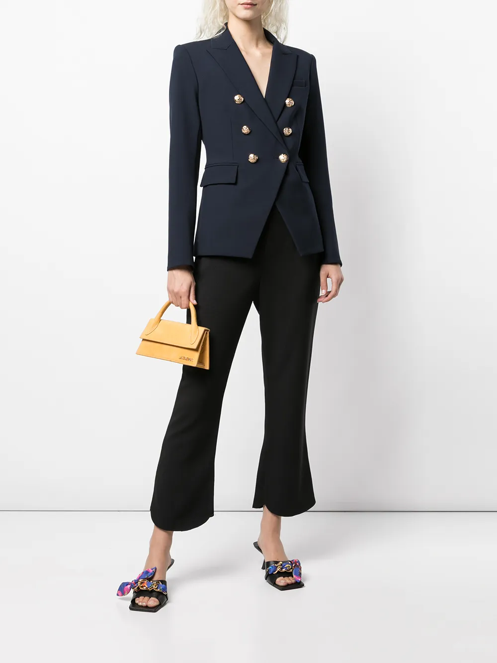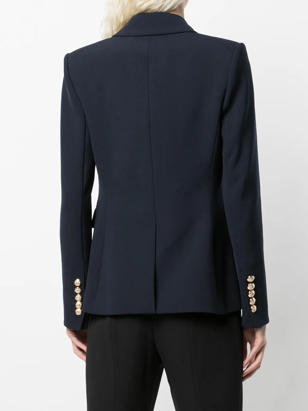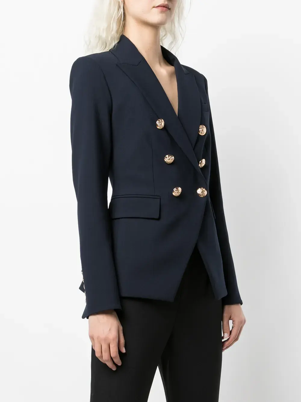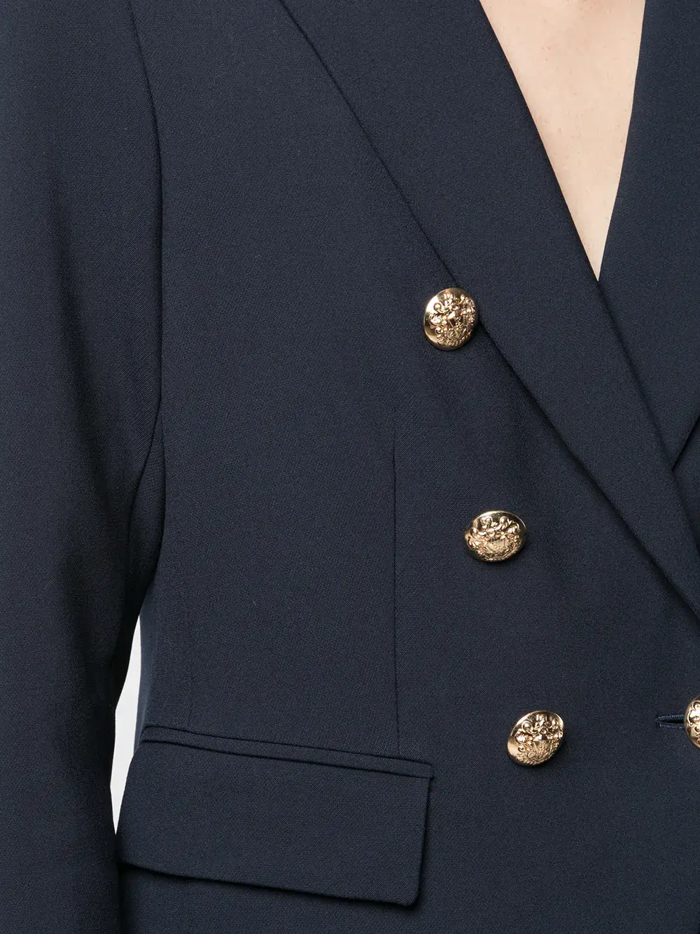 Заостренные лацканы, длинные рукава, двубортная застежка на пуговицы и два кармана с клапанами по бокам.