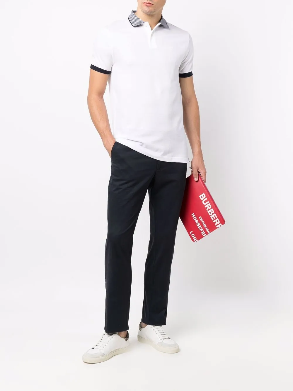Tecido com stretch, нашивка с логотипом сзади, защипы, смещенная застежка на пуговицах спереди, петли для ремня, два прорезных кармана по бокам, два кармана на пуговице сзади и прямой крой.