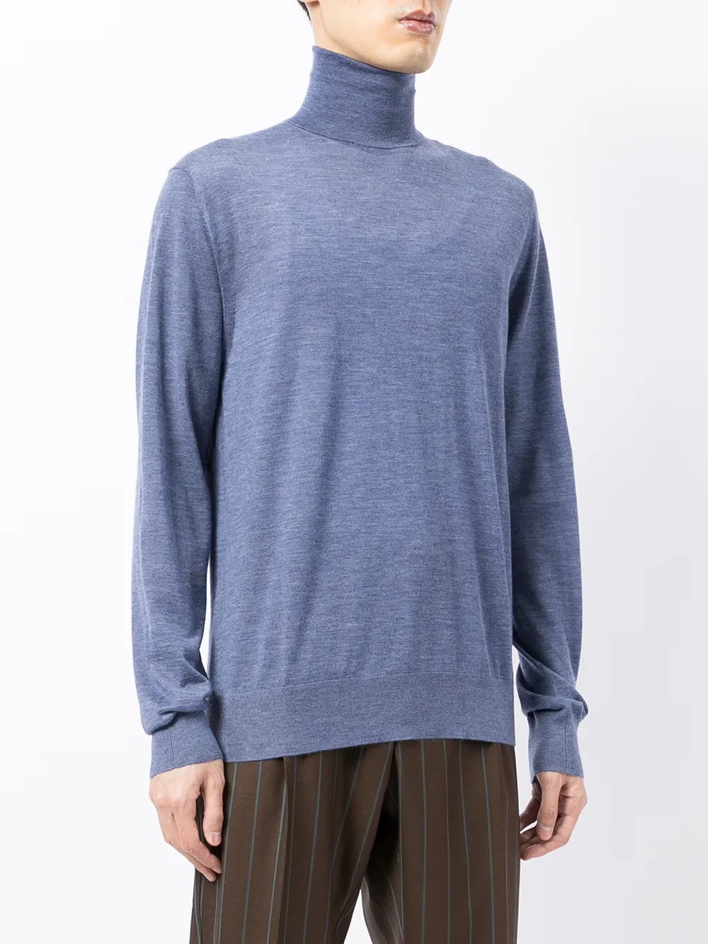 Тонкая вязка, высокий воротник, длинные рукава, манжеты в рубчик и подол в рубчик.