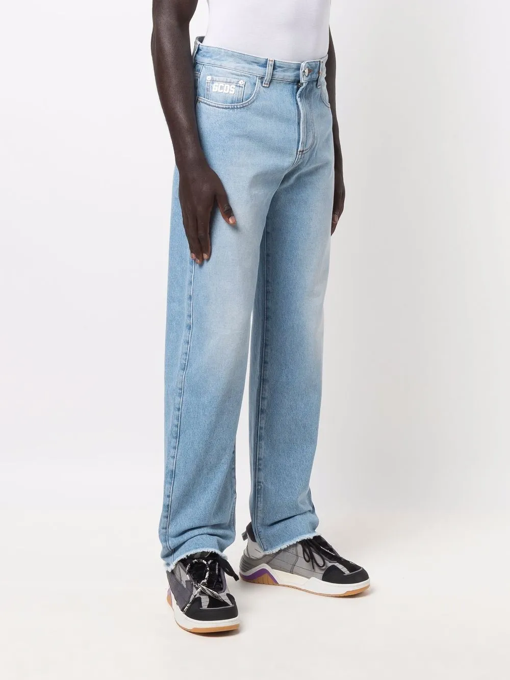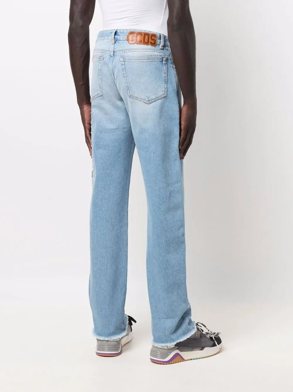 Модель из обработанного денима, загнутые края, средняя посадка, нашивка с логотипом спереди, застежка на молнии и пуговице спереди, прорезные карманы по бокам и петли для ремня. Цвет: синий.