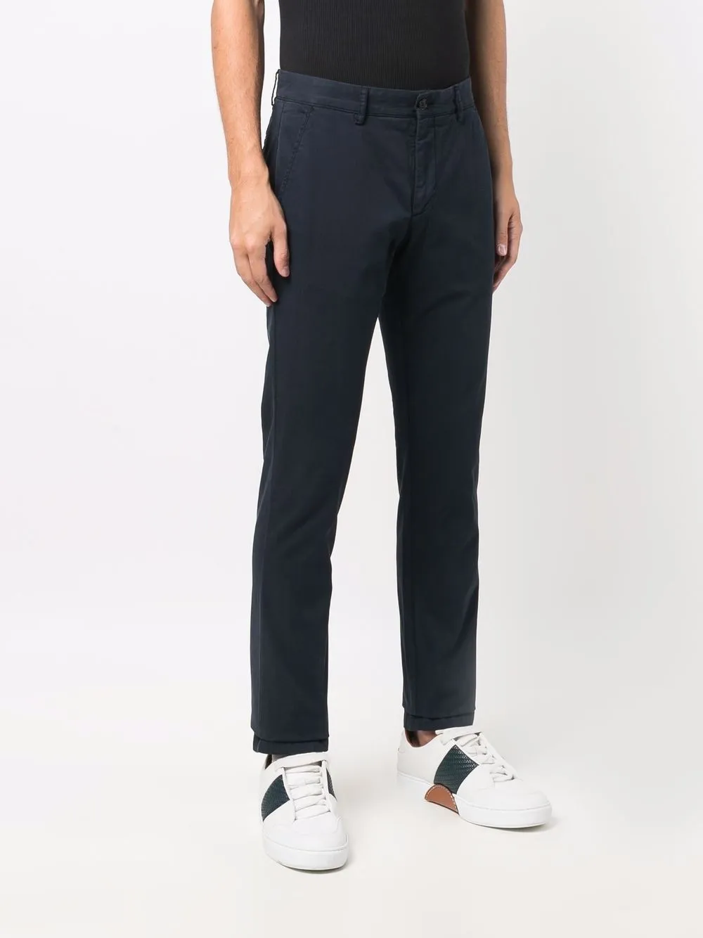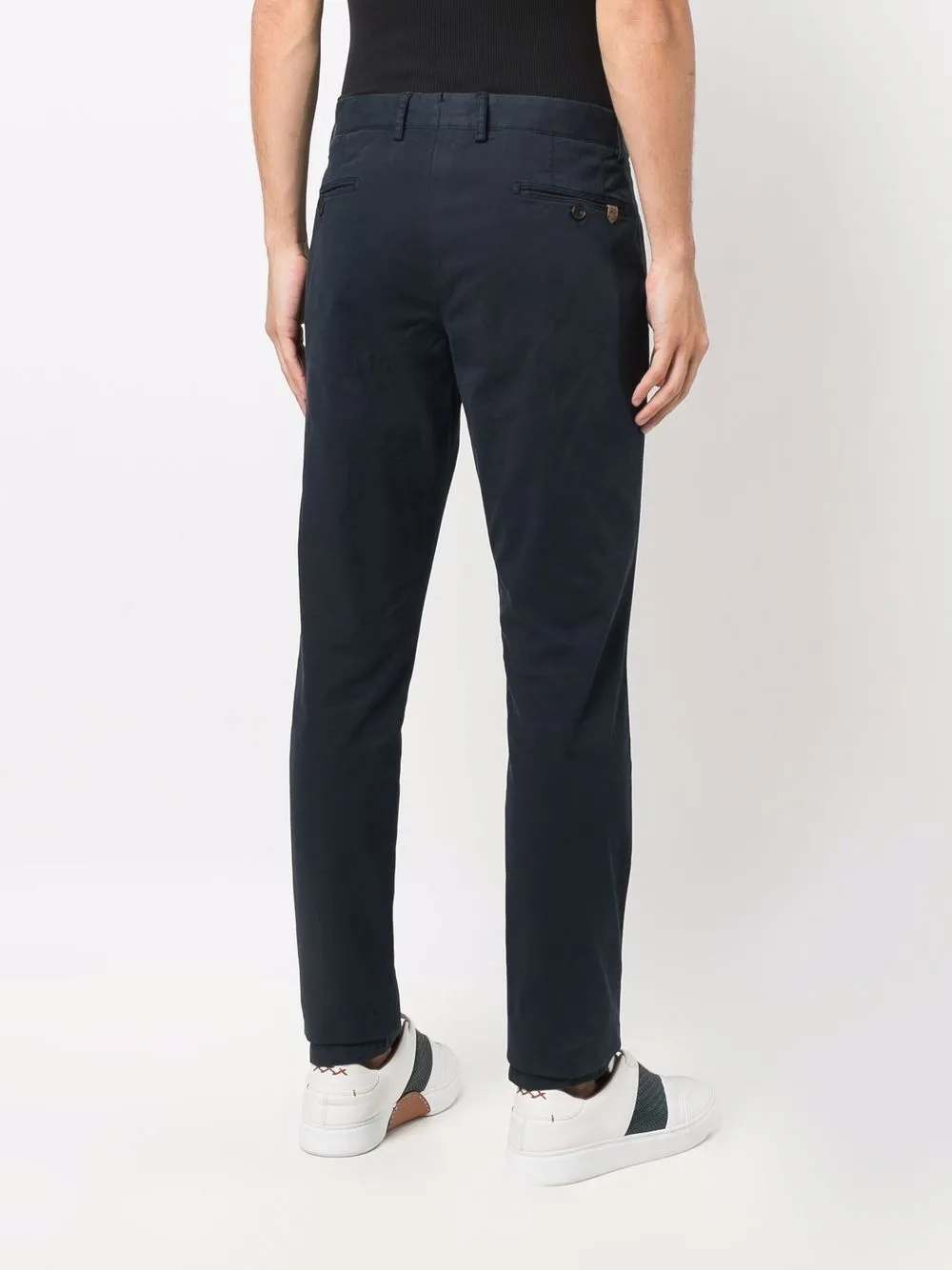 Средняя посадка, петли для ремня, застежка на молнии и пуговице спереди, два прорезных кармана по бокам и два прорезных кармана на пуговицах сзади.