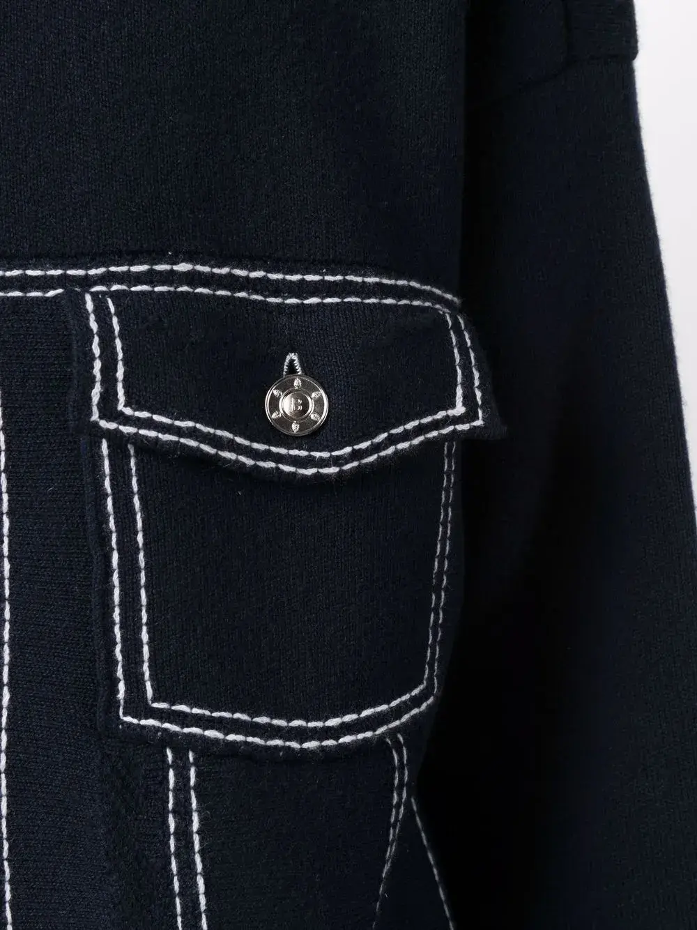 Контрастная строчка, два передних кармана с клапанами, классический воротник, застежка на пуговицах спереди, длинные рукава и прямой подол.