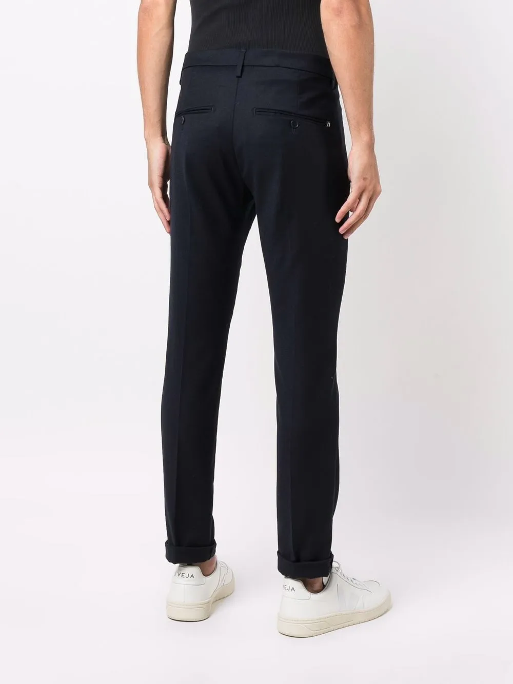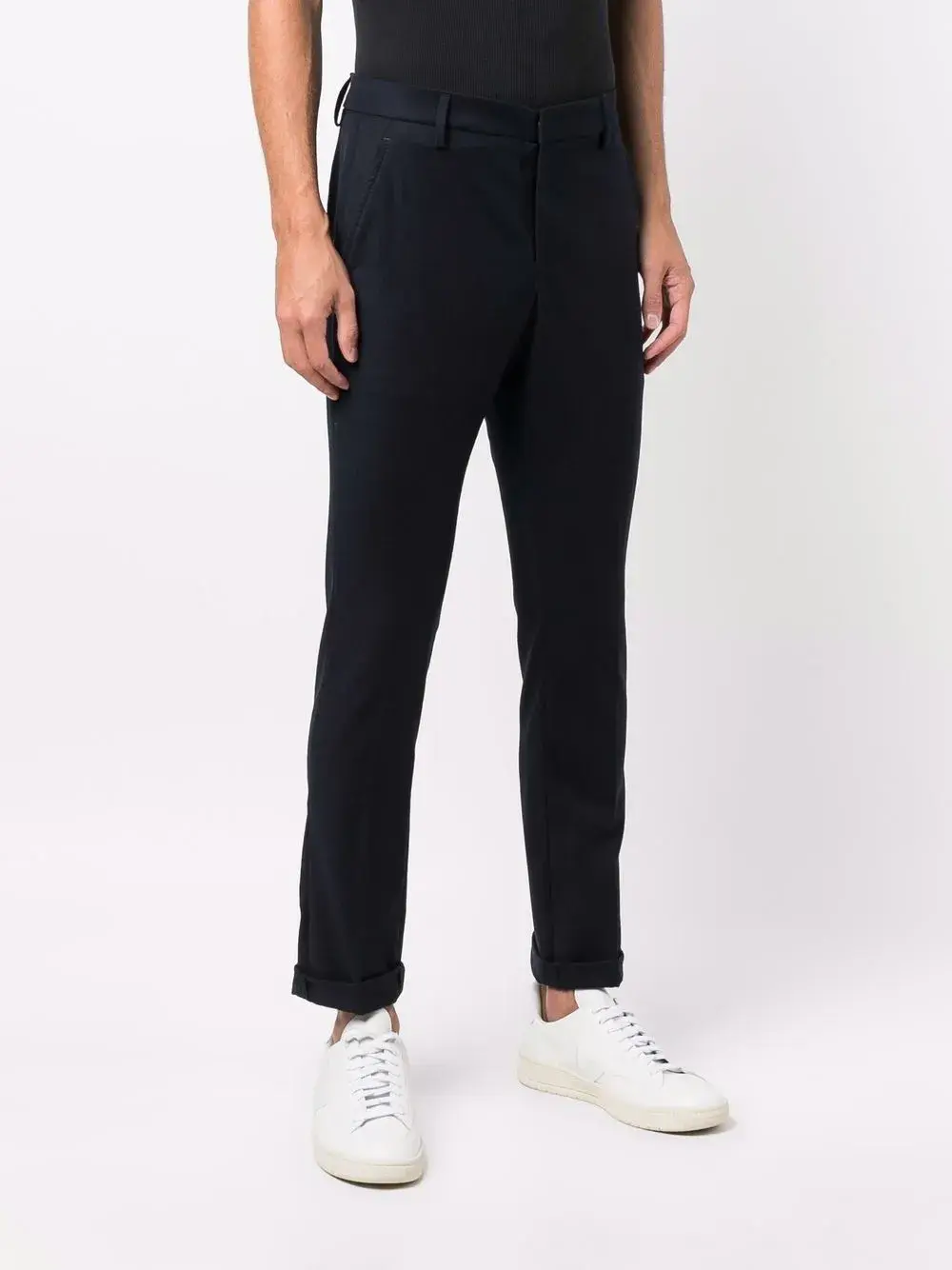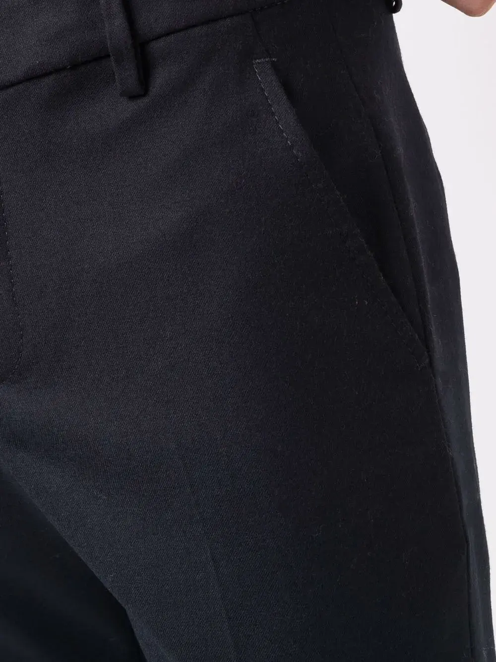 Прямой крой, укороченная длина, петли для ремня, потайная застежка спереди, два прорезных кармана по бокам, два кармана с листочкой сзади и подвороты.