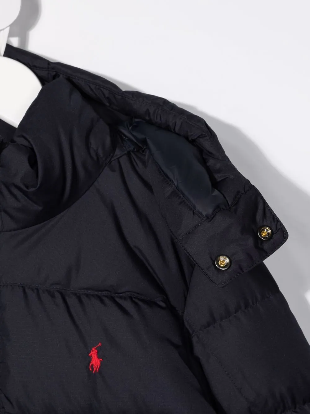 Дутый материал, знаковый логотип Polo Pony, классический капюшон, застежка на молнии спереди, два кармана на молнии по бокам и длинные рукава. Цвет: синий. .