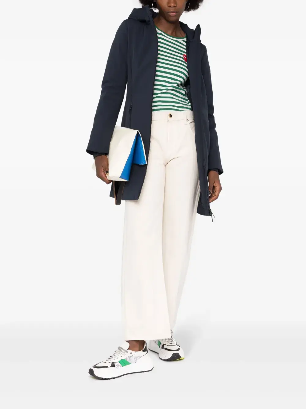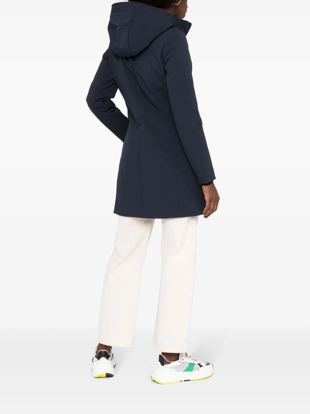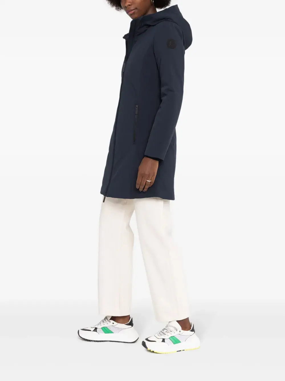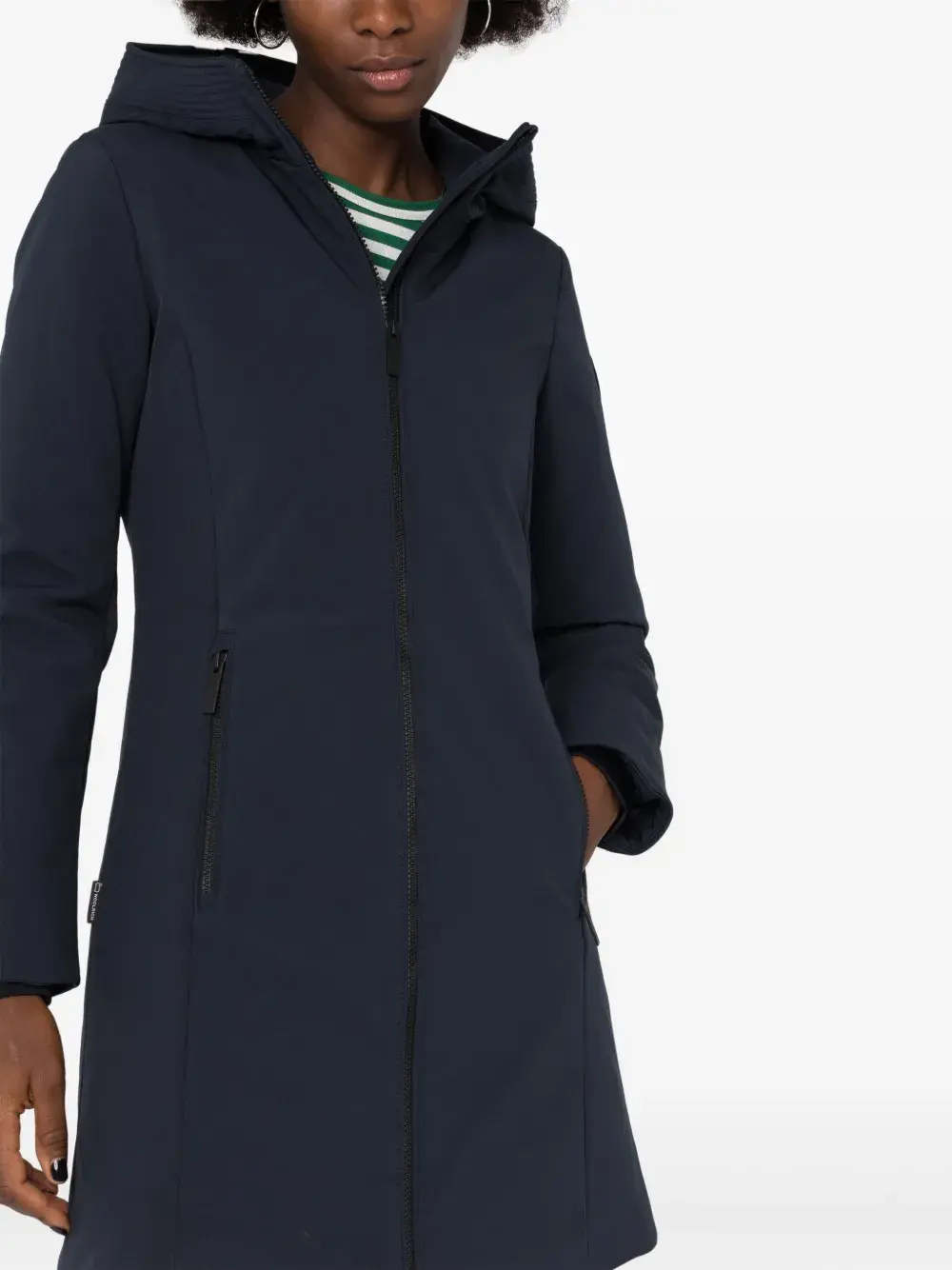 Нашивка с логотипом на рукаве, объемный капюшон, двусторонняя молния спереди, длинные рукава, два кармана на молнии по бокам, длина миди и наполнитель из смеси пуха и пера.